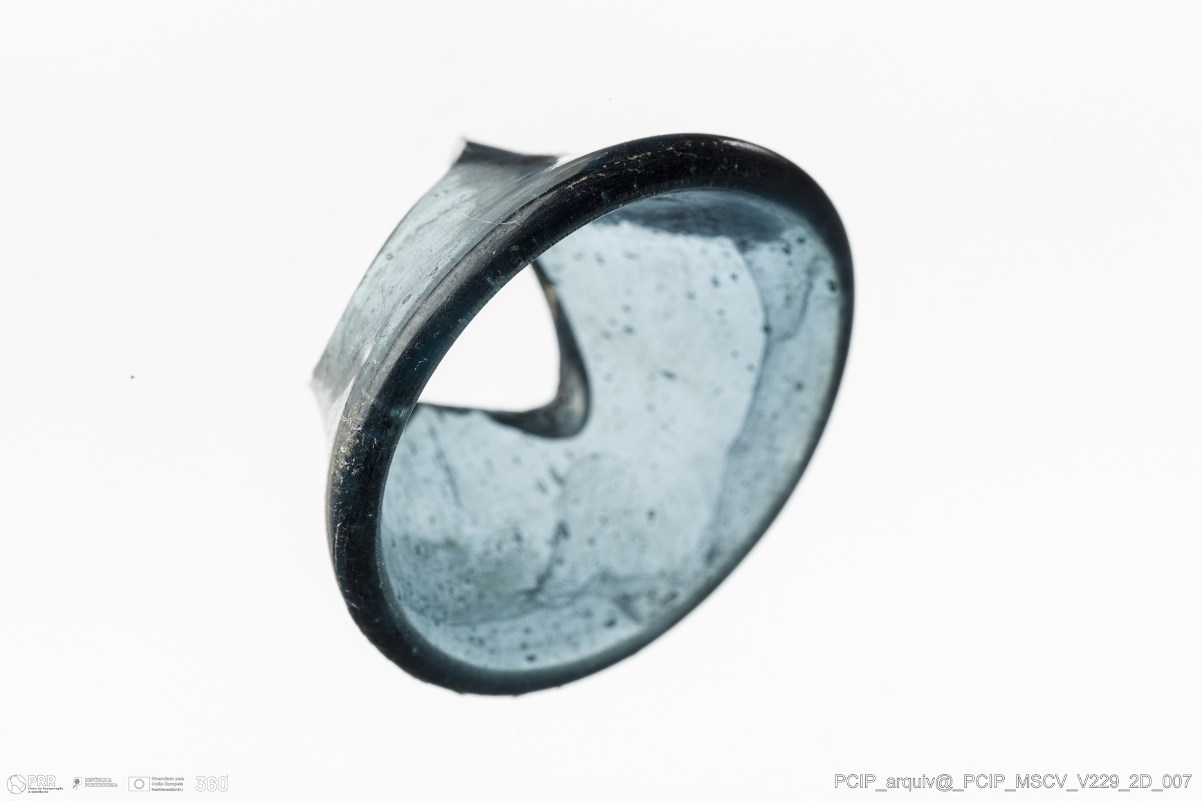 Matéria/Técnica: Vidro; Cronologia: Século XVII; Autoria: Desconhecida; Dimensões: Diâmetro bordo: 28mm.