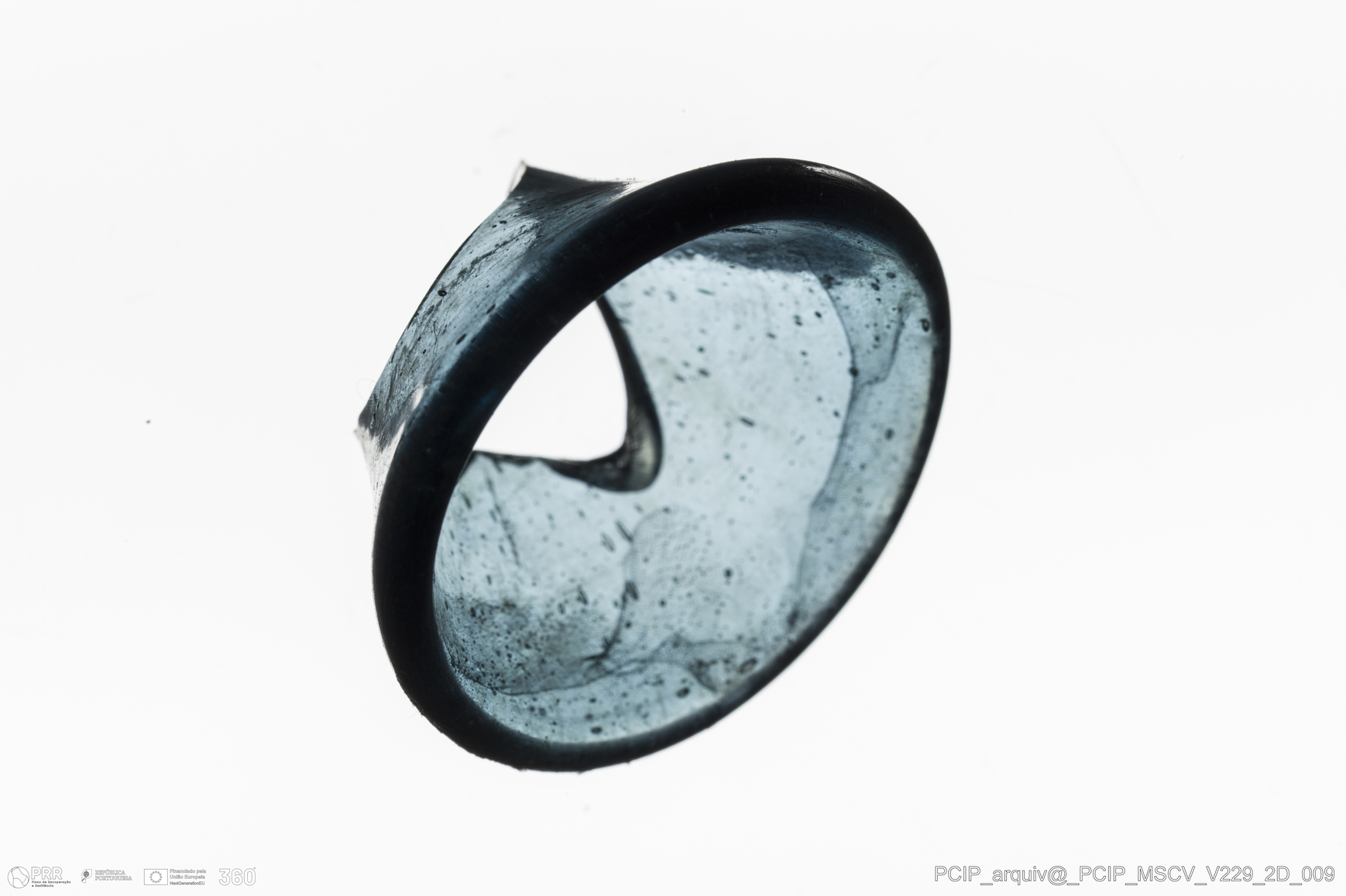Matéria/Técnica: Vidro; Cronologia: Século XVII; Autoria: Desconhecida; Dimensões: Diâmetro bordo: 28mm.