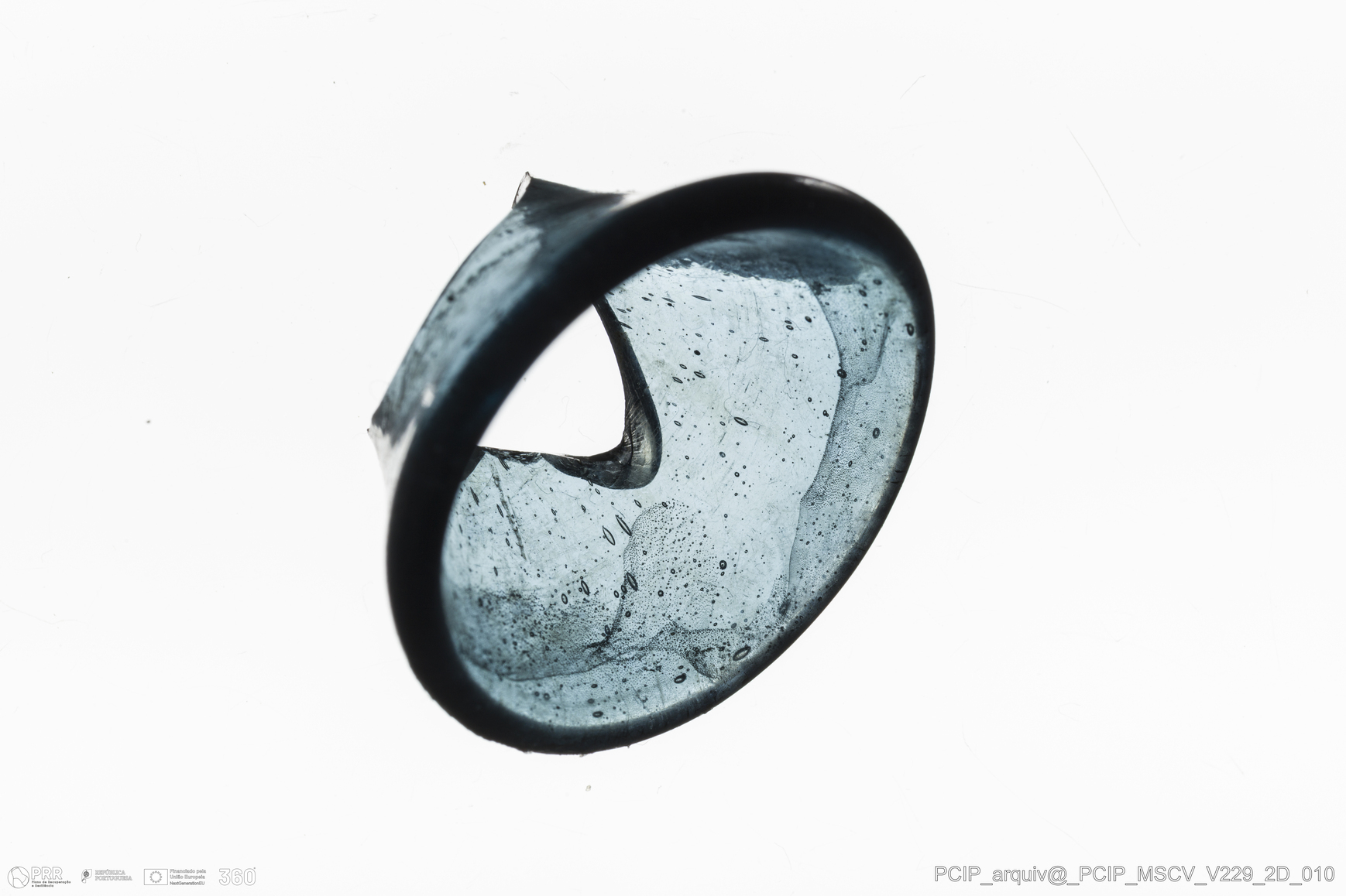 Matéria/Técnica: Vidro; Cronologia: Século XVII; Autoria: Desconhecida; Dimensões: Diâmetro bordo: 28mm.