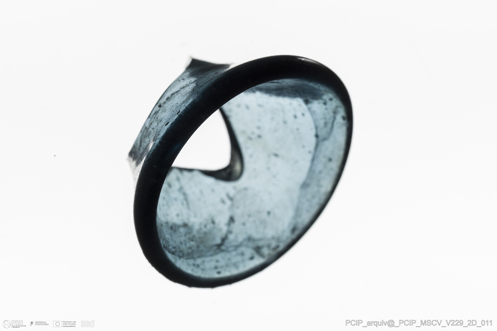 Matéria/Técnica: Vidro; Cronologia: Século XVII; Autoria: Desconhecida; Dimensões: Diâmetro bordo: 28mm.