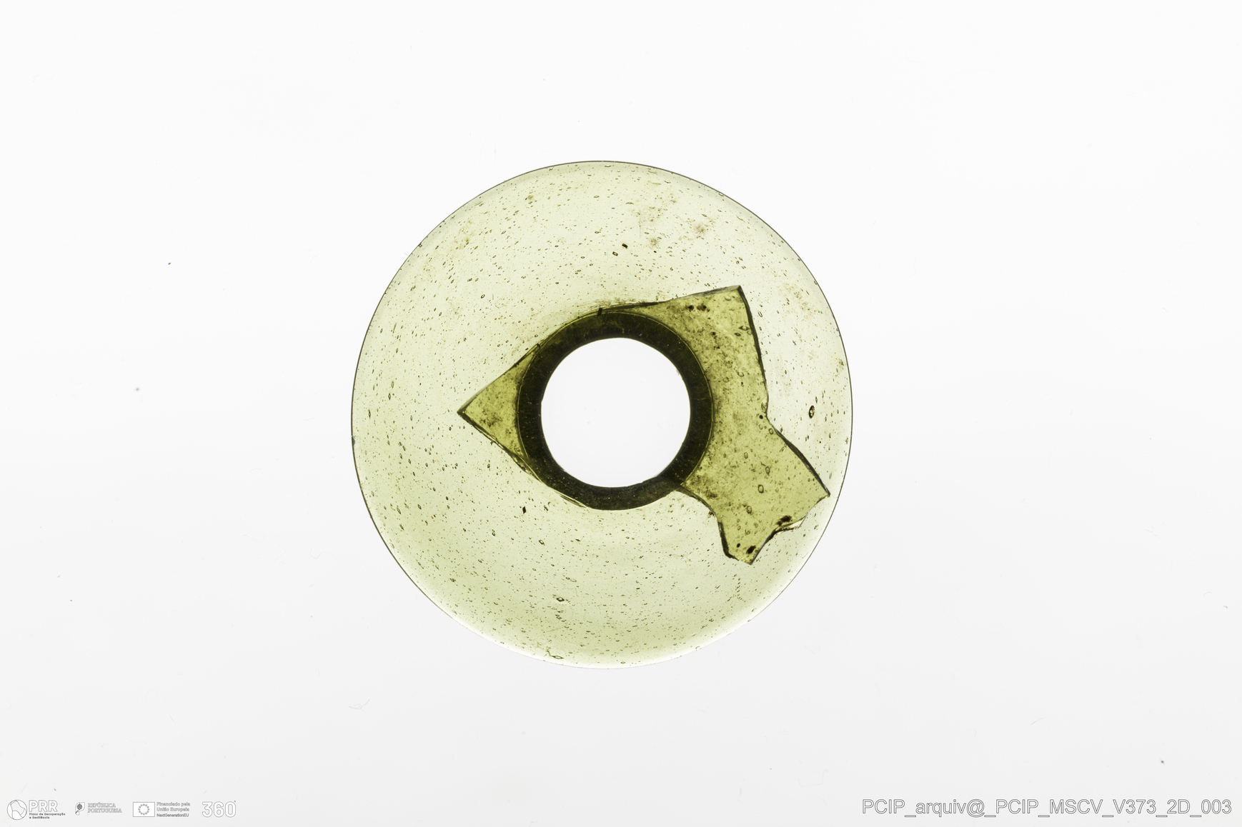 Matéria/Técnica: Vidro; Cronologia: Século XVII; Autoria: Desconhecida; Dimensões: Diâmetro bordo: 47mm.