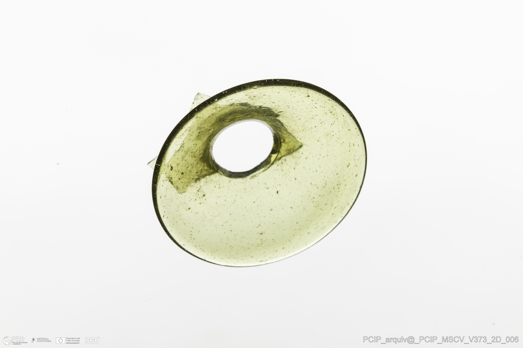 Matéria/Técnica: Vidro; Cronologia: Século XVII; Autoria: Desconhecida; Dimensões: Diâmetro bordo: 47mm.
