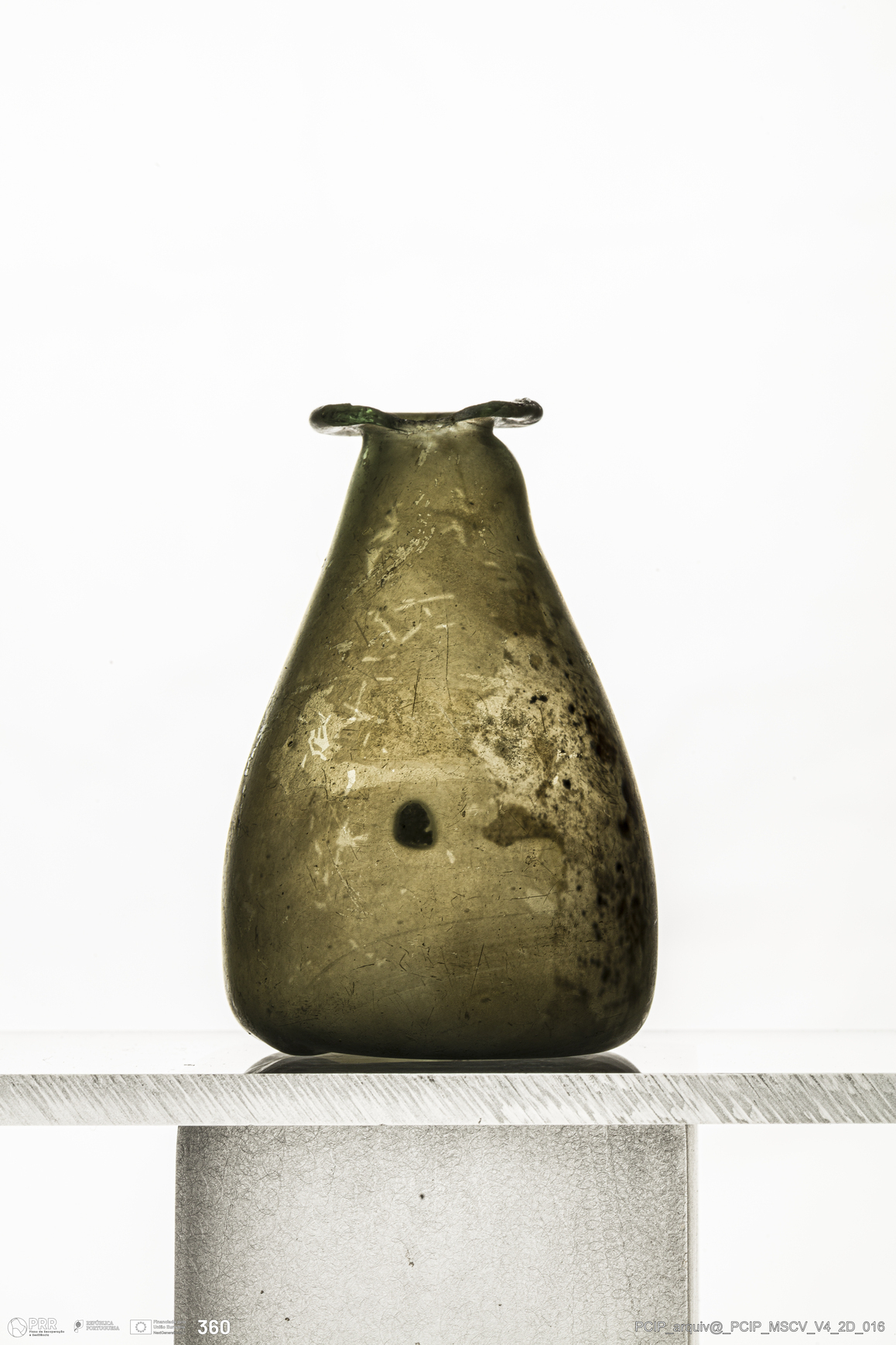Matéria/Técnica: Vidro; Cronologia: Século XVII; Autoria: Desconhecida; Dimensões: Diâmetro bordo: 24mm; Diâmetro base: 24mm; Altura: 65mm.