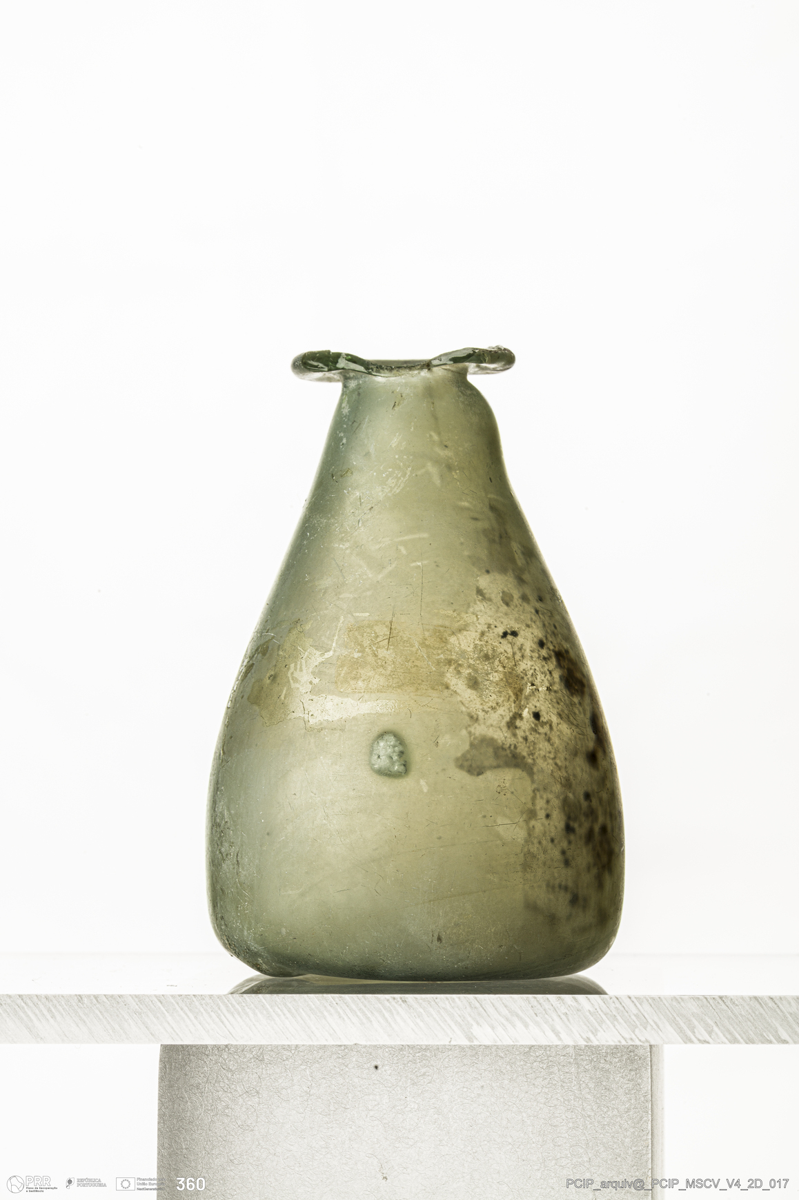 Matéria/Técnica: Vidro; Cronologia: Século XVII; Autoria: Desconhecida; Dimensões: Diâmetro bordo: 24mm; Diâmetro base: 24mm; Altura: 65mm.