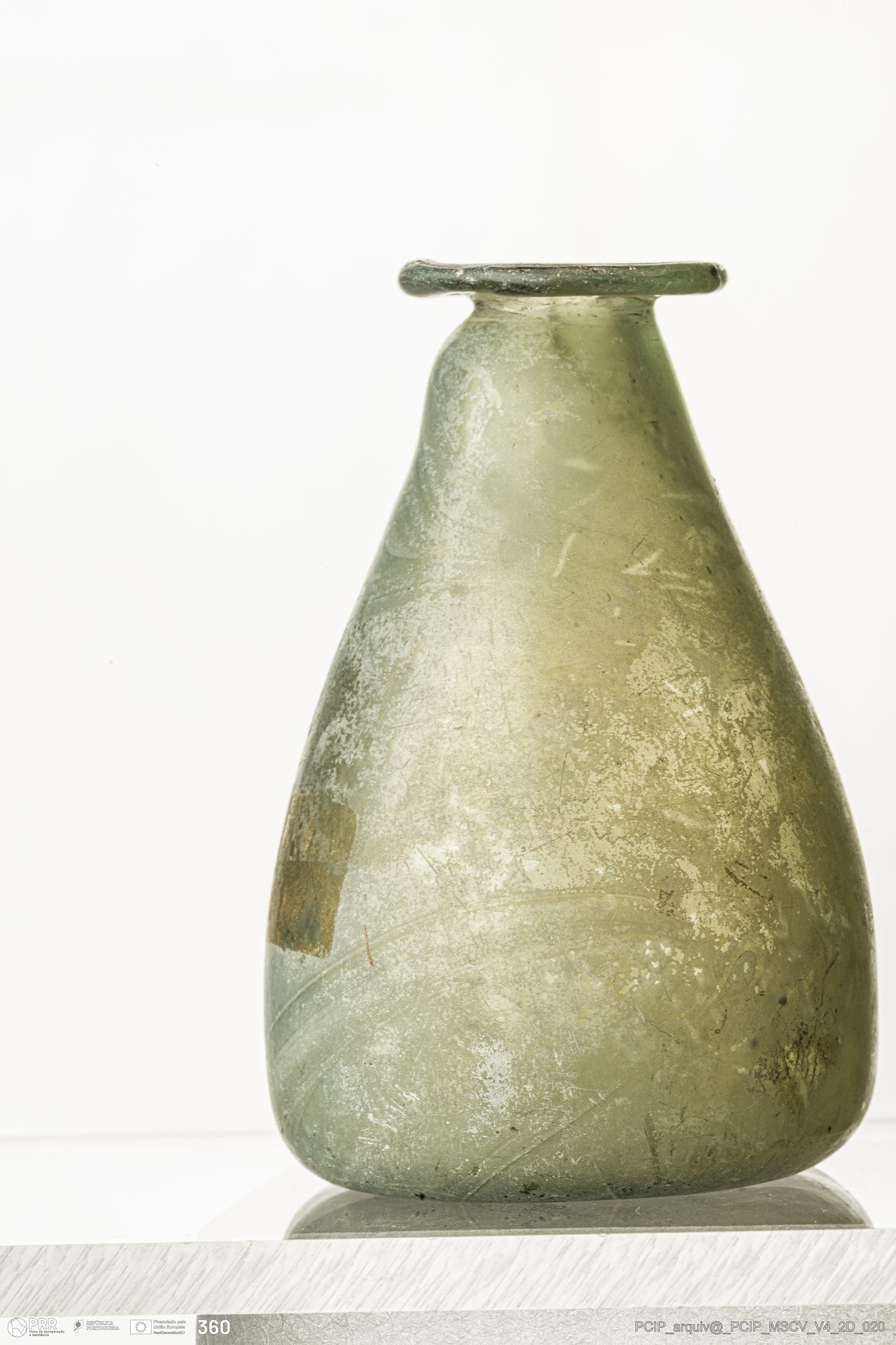 Matéria/Técnica: Vidro; Cronologia: Século XVII; Autoria: Desconhecida; Dimensões: Diâmetro bordo: 24mm; Diâmetro base: 24mm; Altura: 65mm.