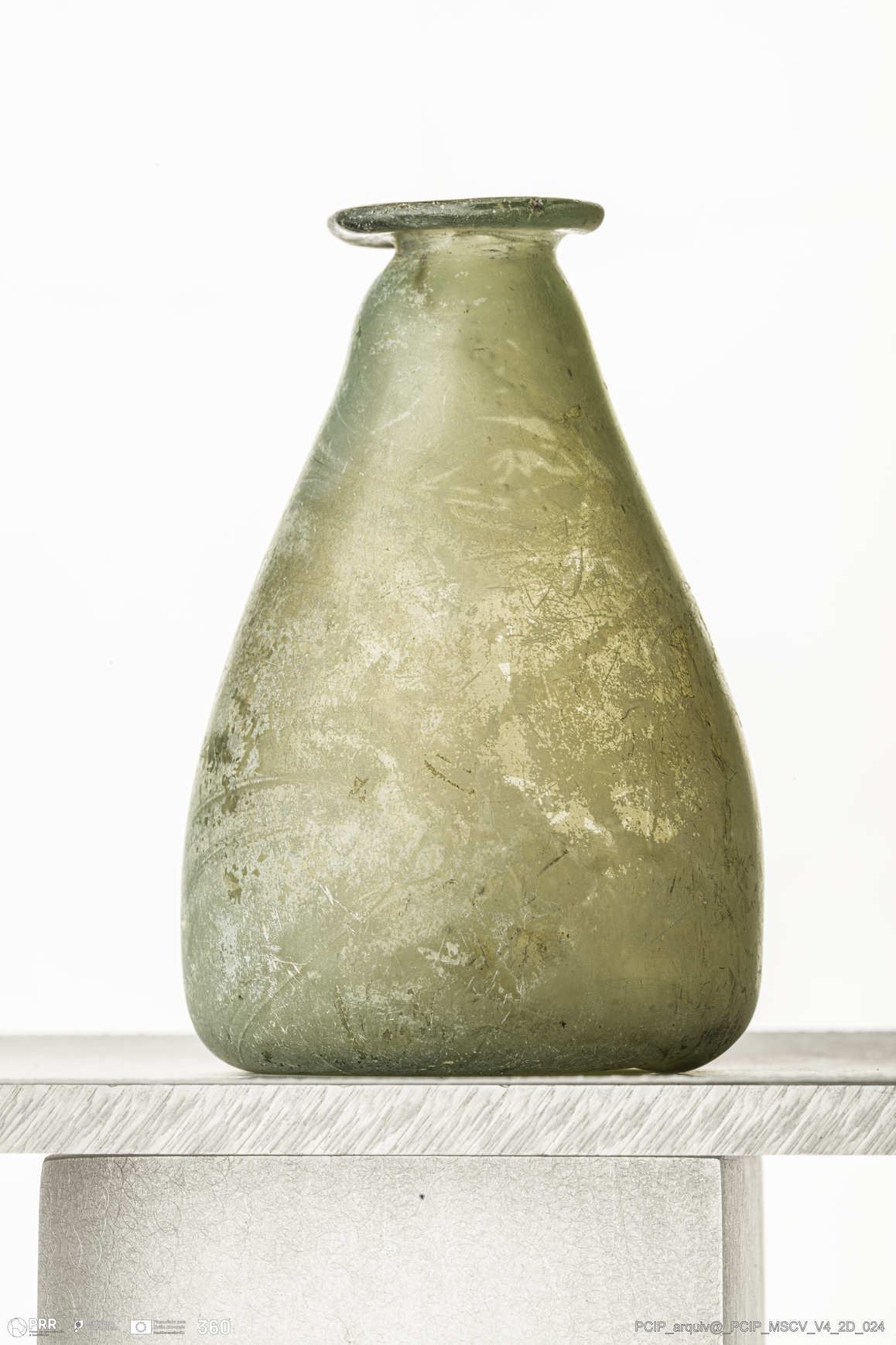 Matéria/Técnica: Vidro; Cronologia: Século XVII; Autoria: Desconhecida; Dimensões: Diâmetro bordo: 24mm; Diâmetro base: 24mm; Altura: 65mm.