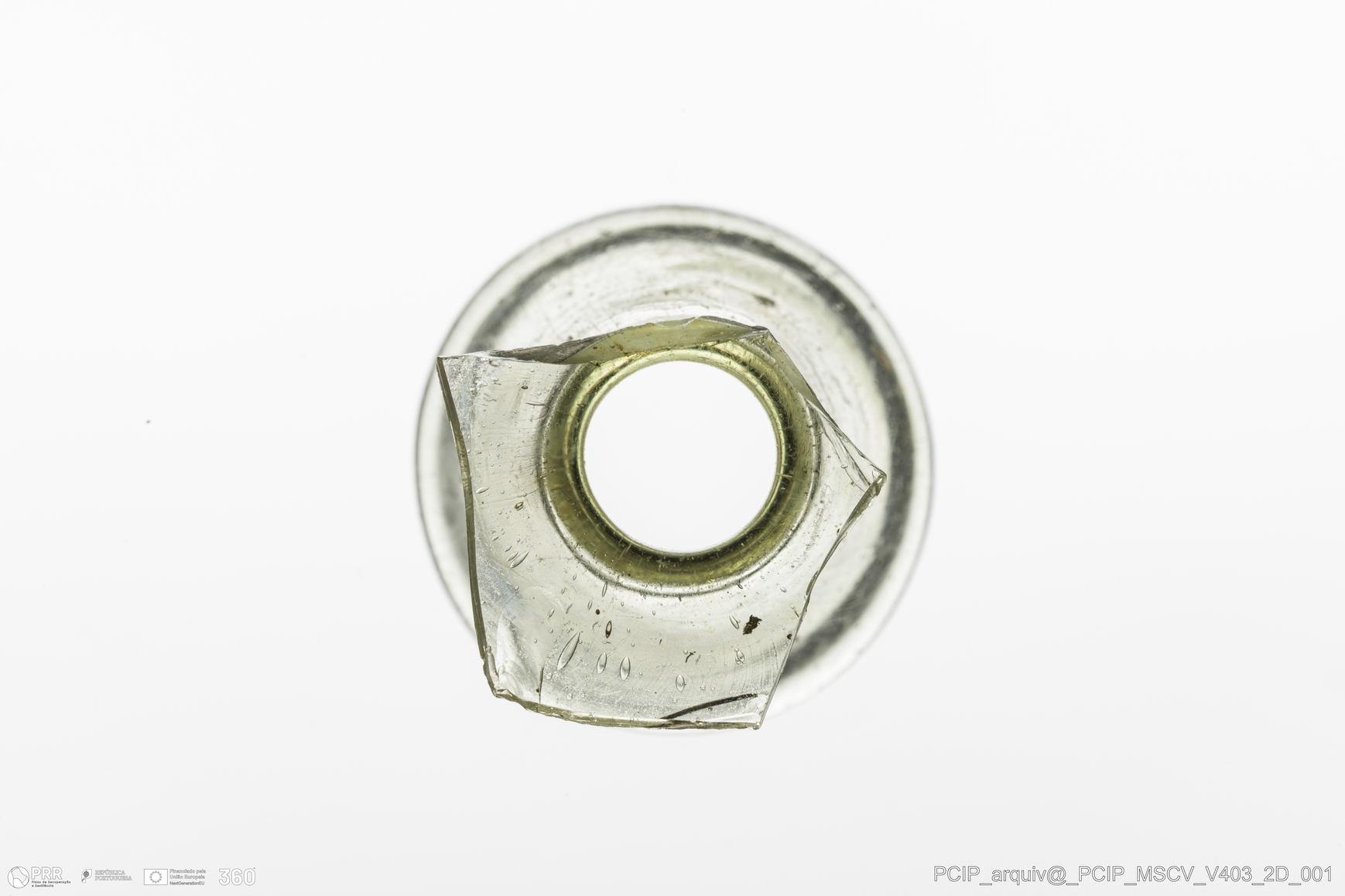 Matéria/Técnica: Vidro; Cronologia: Século XVII; Autoria: Desconhecida; Dimensões: Diâmetro bordo: 21mm.