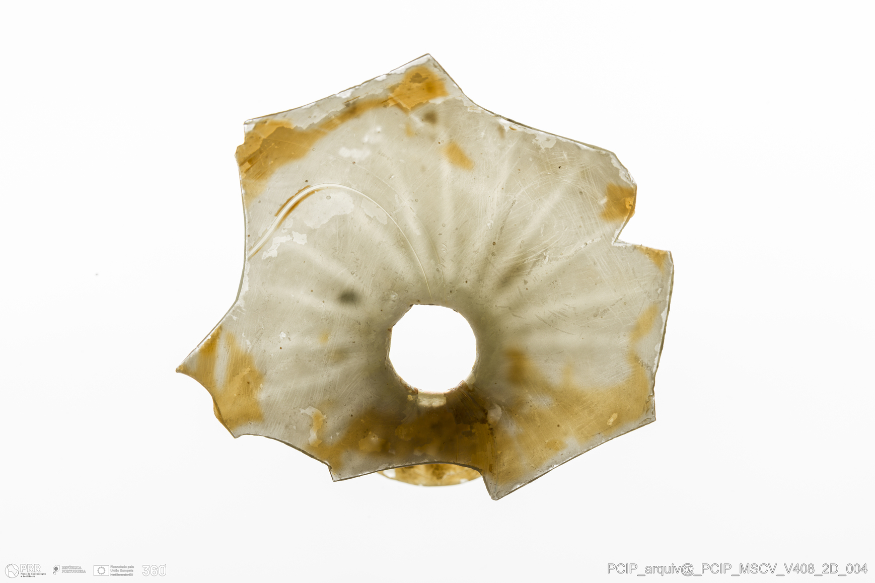 Matéria/Técnica: Vidro; Cronologia: Século XVII; Autoria: Desconhecida; Dimensões: Diâmetro bordo: 30mm.