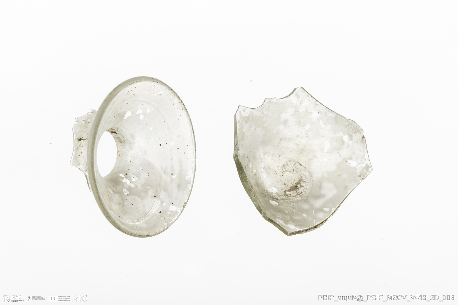Matéria/Técnica: Vidro; Cronologia: Século XVII; Autoria: Desconhecida; Dimensões: Diâmetro bordo: 38mm.