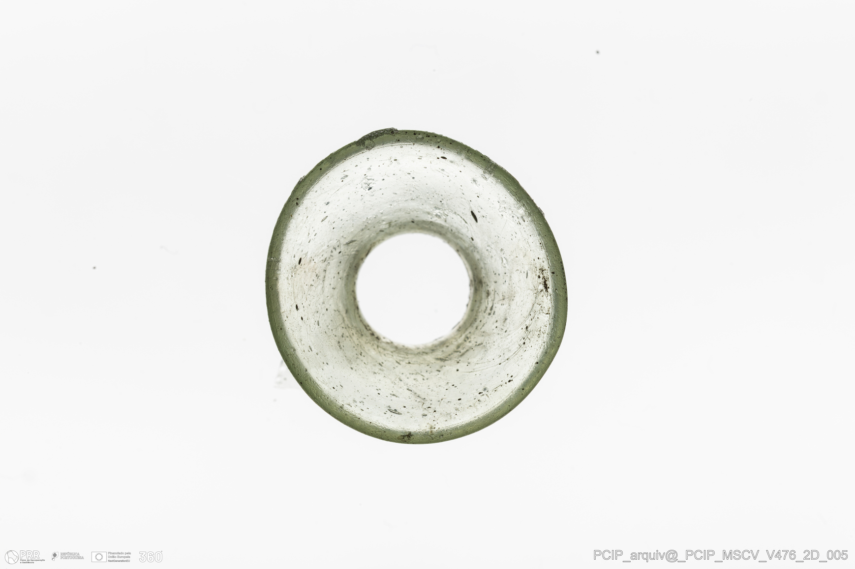 Matéria/Técnica: Vidro; Cronologia: Século XVII; Autoria: Desconhecida; Dimensões: Diâmetro Bordo: 24mm.