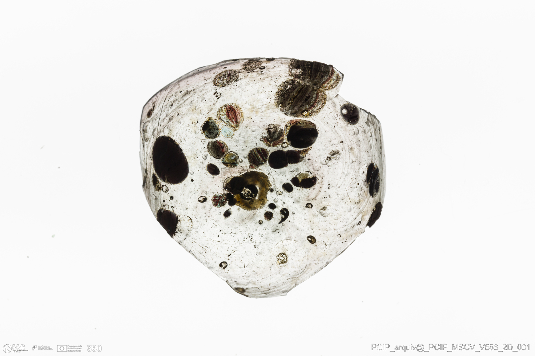 Matéria/Técnica: Vidro; Cronologia: Século XVII; Autoria: Desconhecida; Dimensões: comprimento: 38mm; Largura: 18mm.