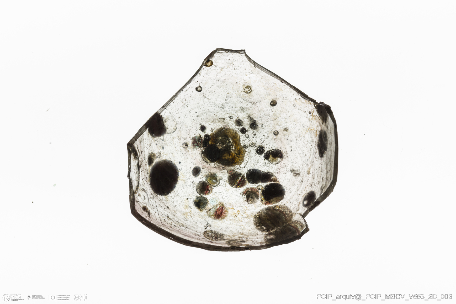 Matéria/Técnica: Vidro; Cronologia: Século XVII; Autoria: Desconhecida; Dimensões: comprimento: 38mm; Largura: 18mm.
