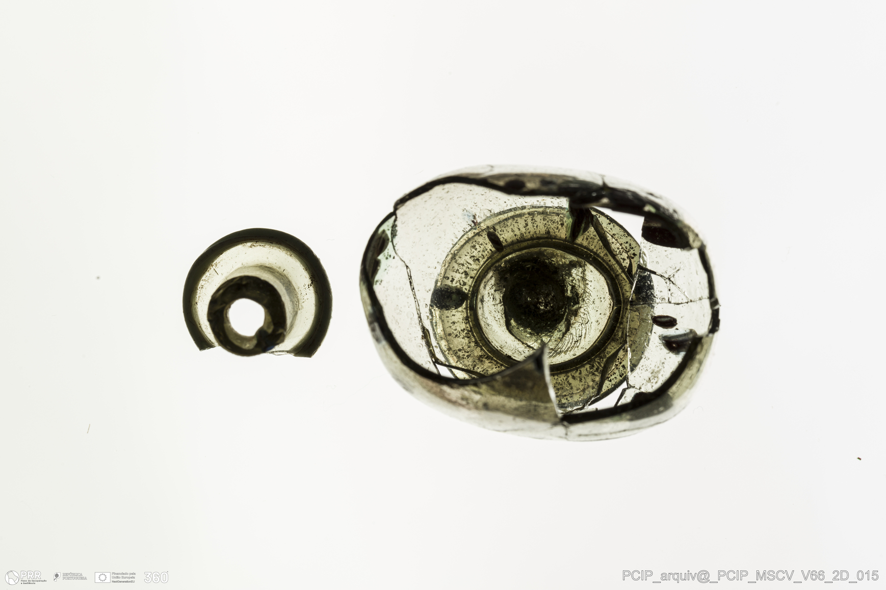 Matéria/Técnica: Vidro; Cronologia: Século XVII; Autoria: Desconhecida; Dimensões: Diâmetro bordo: 21mm; Diâmetro base: 31mm; Altura: 105mm.
