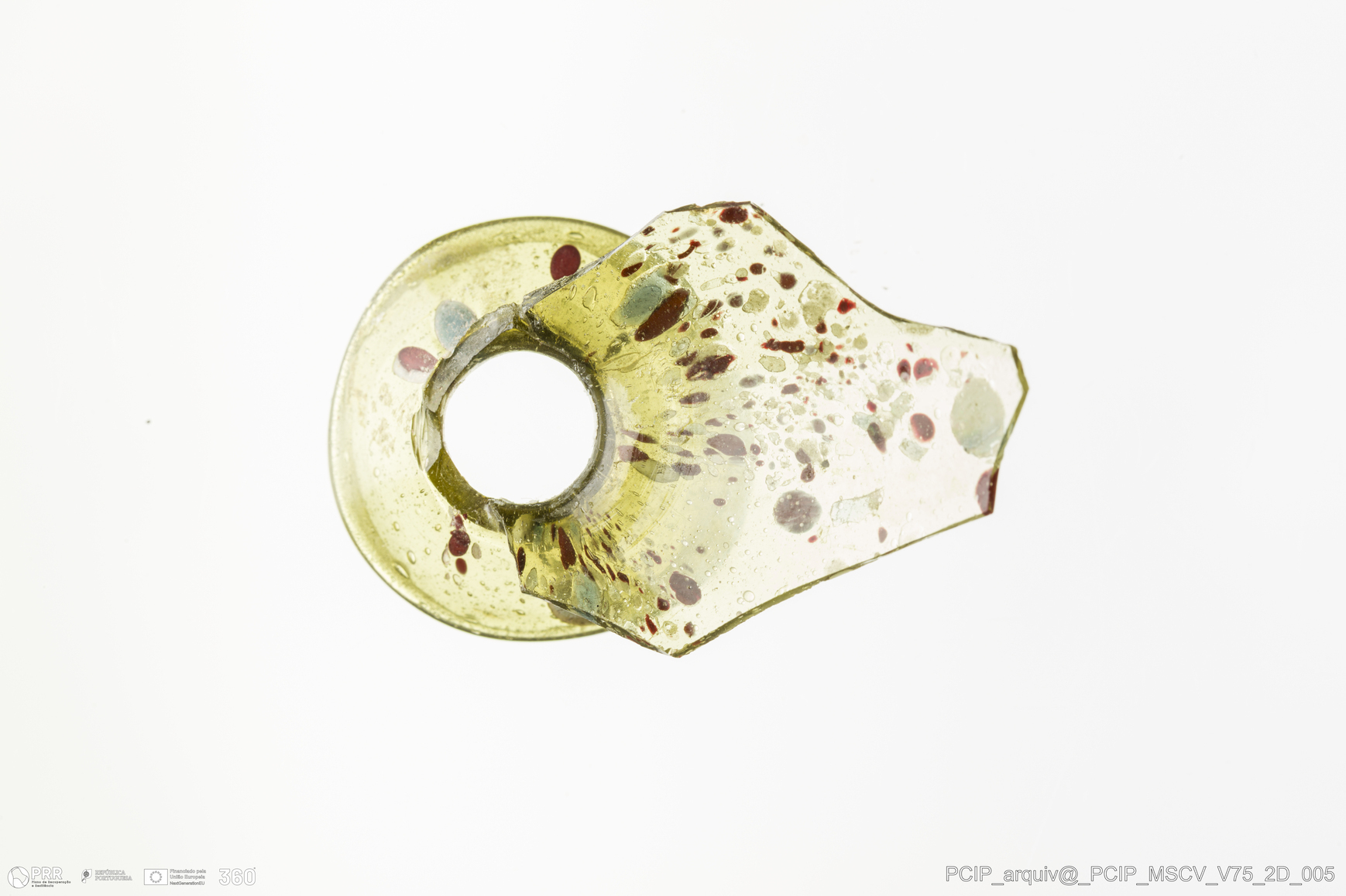 Matéria/Técnica: Vidro; Cronologia: Século XVII; Autoria: Desconhecida; Dimensões: Diâmetro bordo: 25mm.