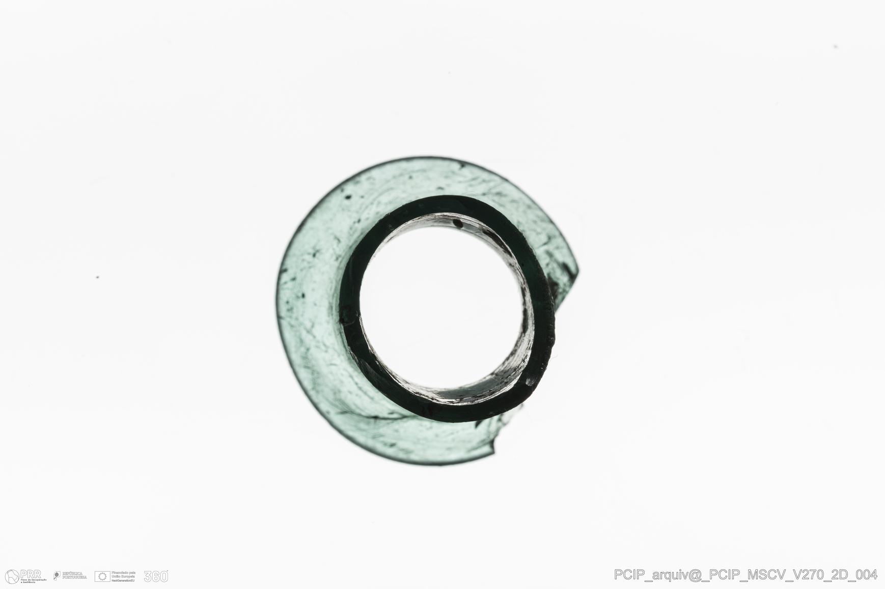 Matéria/Técnica: Vidro; Cronologia: Século XVII; Autoria: Desconhecida; Dimensões: Diâmetro bordo: 20mm.