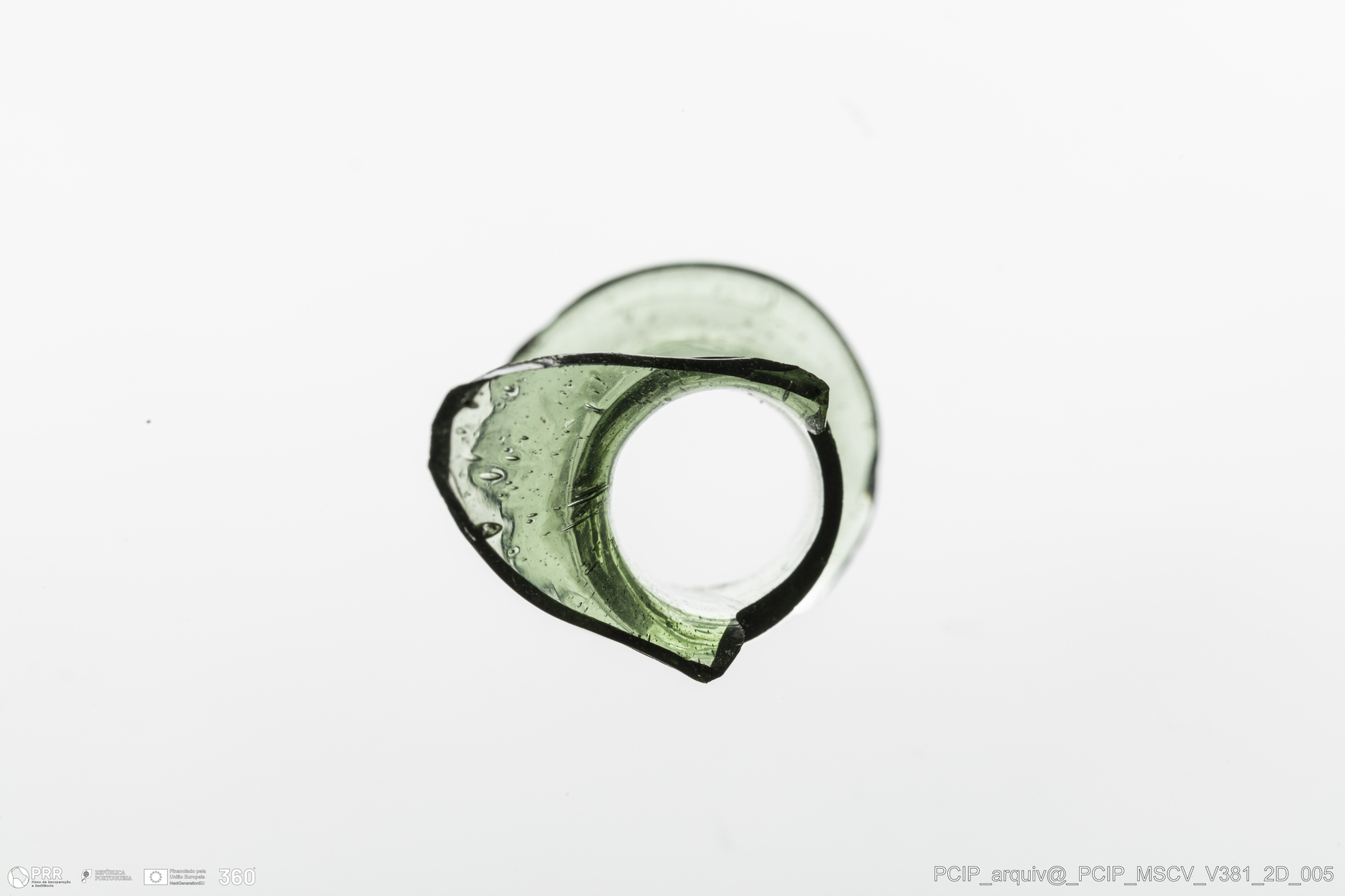 Matéria/Técnica: Vidro; Cronologia: Século XVII; Autoria: Desconhecida; Dimensões: Diâmetro bordo: 21mm.