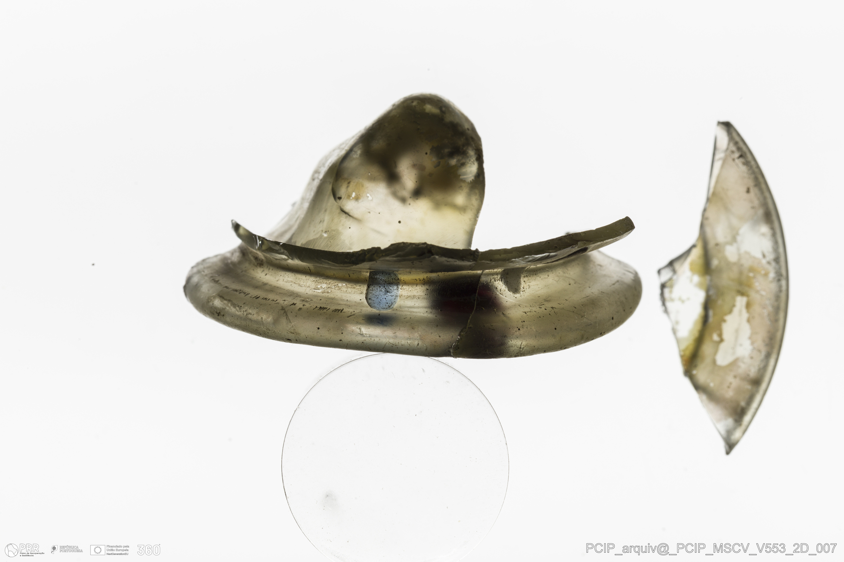 Matéria/Técnica: Vidro; Cronologia: Século XVII; Autoria: Desconhecida; Dimensões: Diâmetro: 43mm; Altura: 20mm.