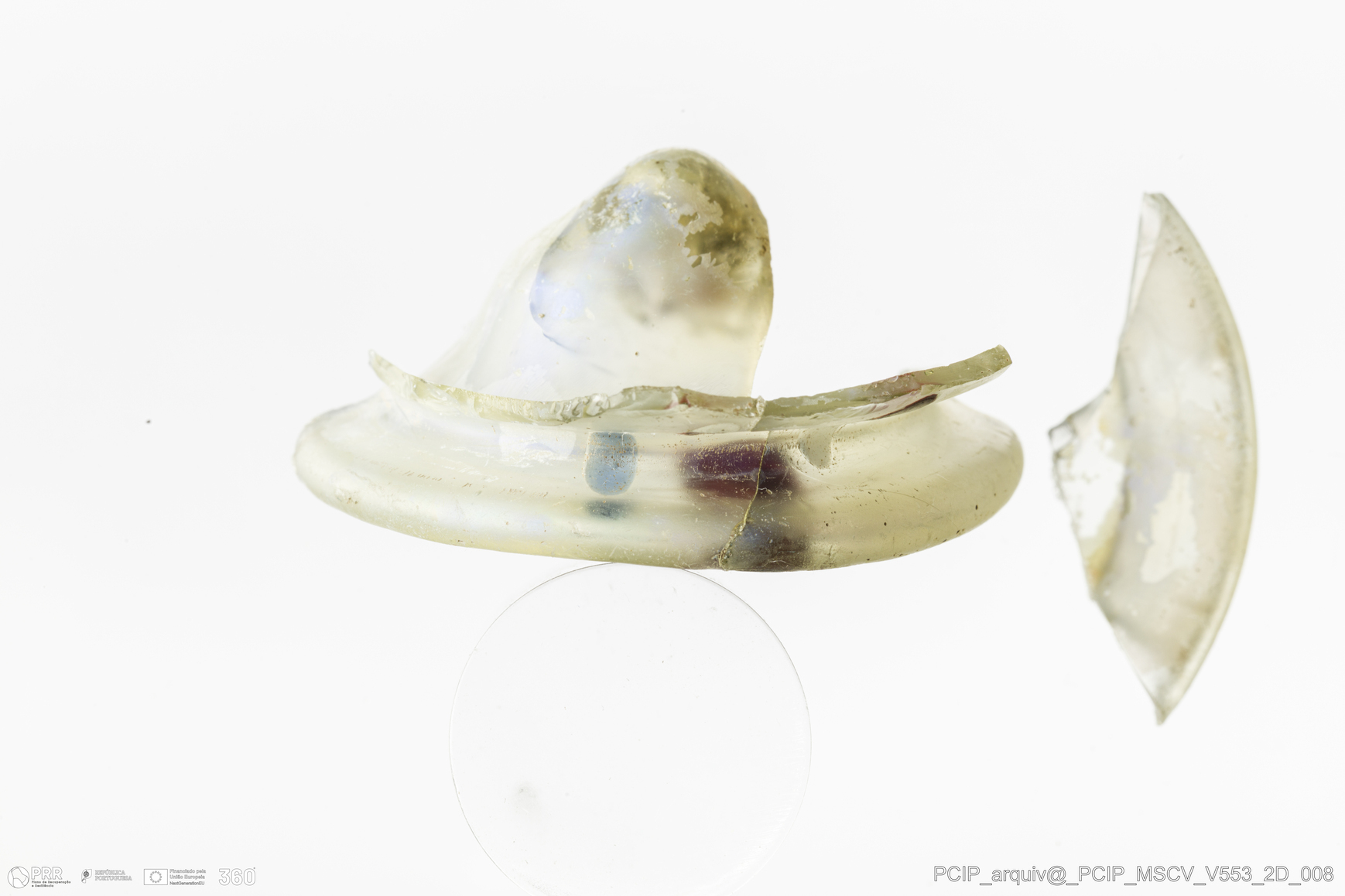 Matéria/Técnica: Vidro; Cronologia: Século XVII; Autoria: Desconhecida; Dimensões: Diâmetro: 43mm; Altura: 20mm.