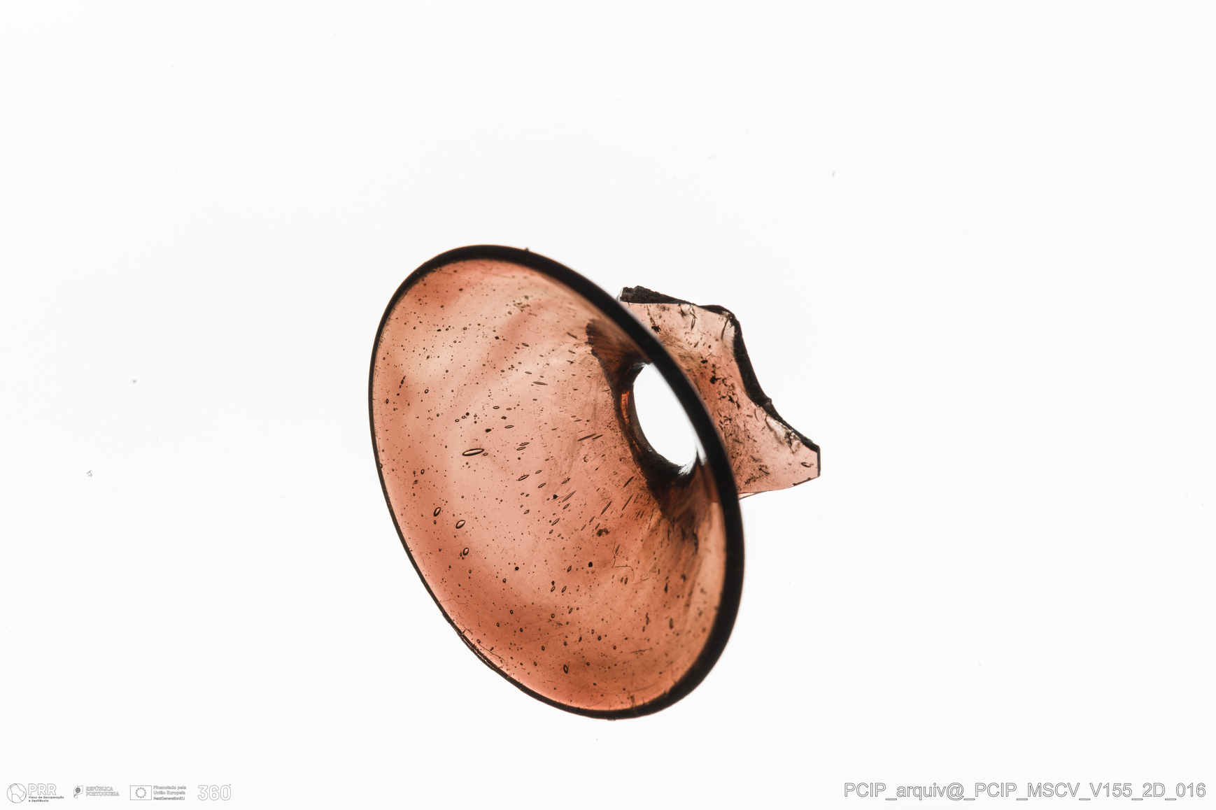 Matéria/Técnica: Vidro; Cronologia: Século XVII; Autoria: Desconhecida; Dimensões: Diâmetro Bordo: 34mm.