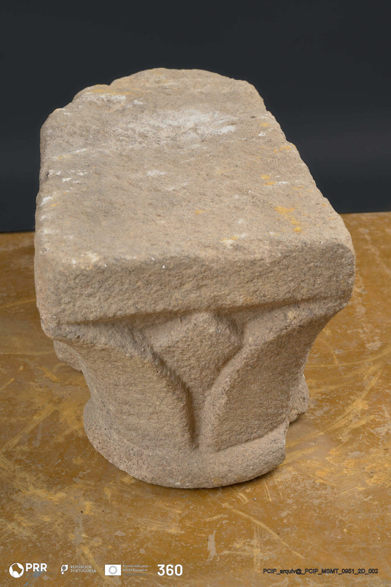 Matéria/Técnica: Granito / Cantaria; Cronologia: Séc. XII/XIII; Autoria: Desconhecido; Dimensões (cm): 23,5 X 22,5 X 48,5.