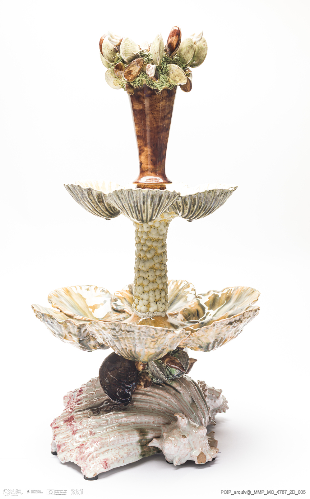 Matéria/Técnica: Barro vermelho moldado e modelado. Vidrado polícromo: verde, castanho, amarelo, rosa e branco; Cronologia: 1890-1925; Autoria: António Alves Cunha / Caldas ada Rainha; Dimensões (cm): Altura: 51,5; Largura: 30; Comprimento: 30.