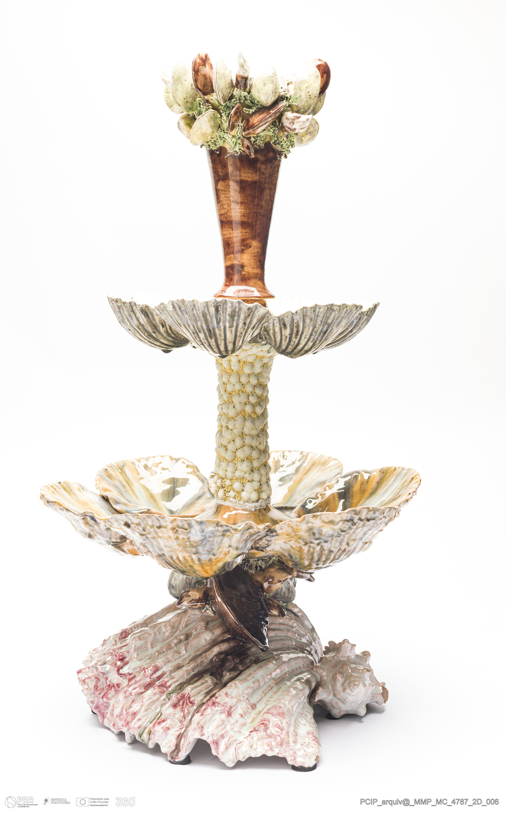 Matéria/Técnica: Barro vermelho moldado e modelado. Vidrado polícromo: verde, castanho, amarelo, rosa e branco; Cronologia: 1890-1925; Autoria: António Alves Cunha / Caldas ada Rainha; Dimensões (cm): Altura: 51,5; Largura: 30; Comprimento: 30.