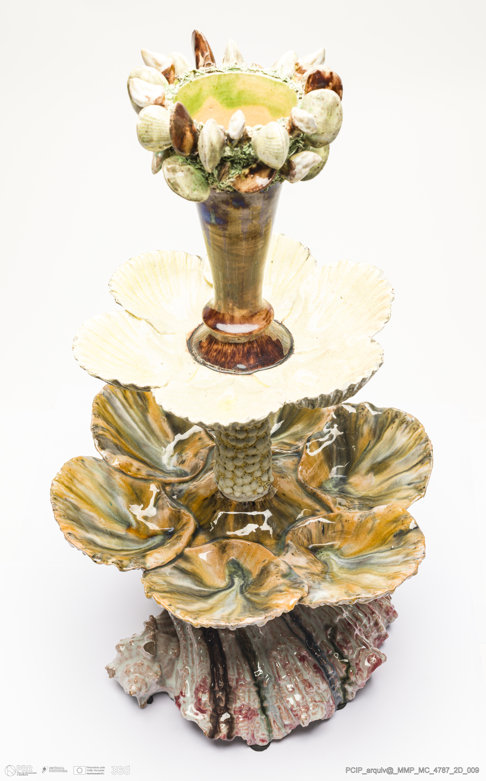 Matéria/Técnica: Barro vermelho moldado e modelado. Vidrado polícromo: verde, castanho, amarelo, rosa e branco; Cronologia: 1890-1925; Autoria: António Alves Cunha / Caldas ada Rainha; Dimensões (cm): Altura: 51,5; Largura: 30; Comprimento: 30.