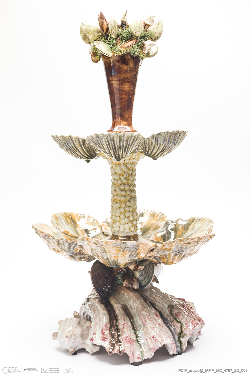Matéria/Técnica: Barro vermelho moldado e modelado. Vidrado polícromo: verde, castanho, amarelo, rosa e branco; Cronologia: 1890-1925; Autoria: António Alves Cunha / Caldas ada Rainha; Dimensões (cm): Altura: 51,5; Largura: 30; Comprimento: 30.