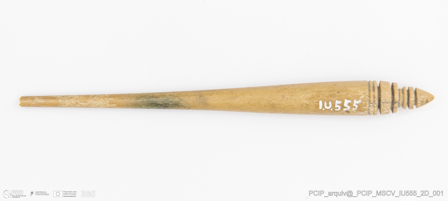 Matéria/Técnica: Osso; Cronologia: Século XVII; Autoria: Desconhecida; Dimensões: Comprimento: 99mm; Espessura: 8mm.