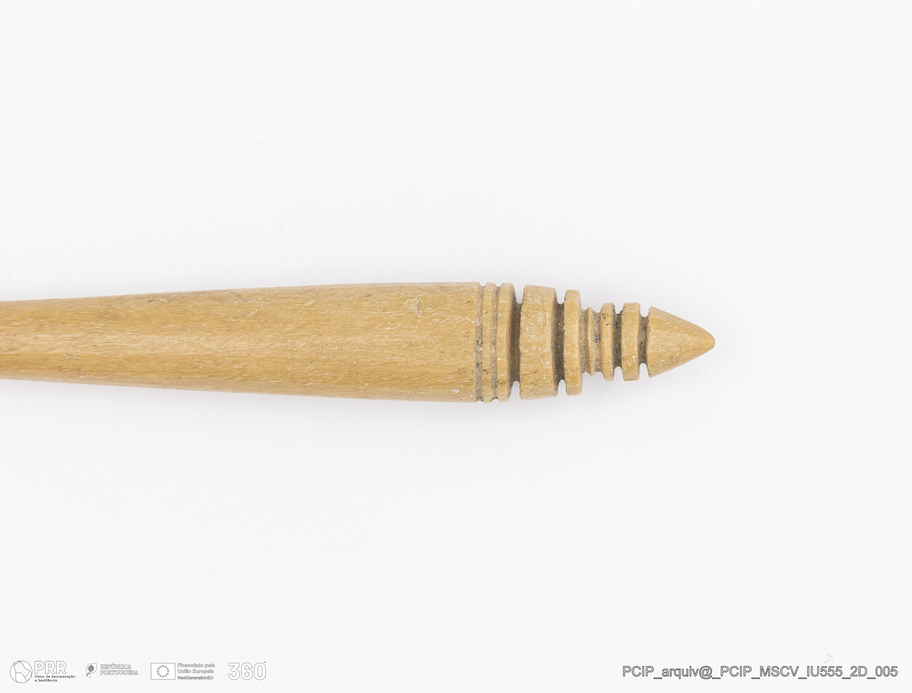 Matéria/Técnica: Osso; Cronologia: Século XVII; Autoria: Desconhecida; Dimensões: Comprimento: 99mm; Espessura: 8mm.