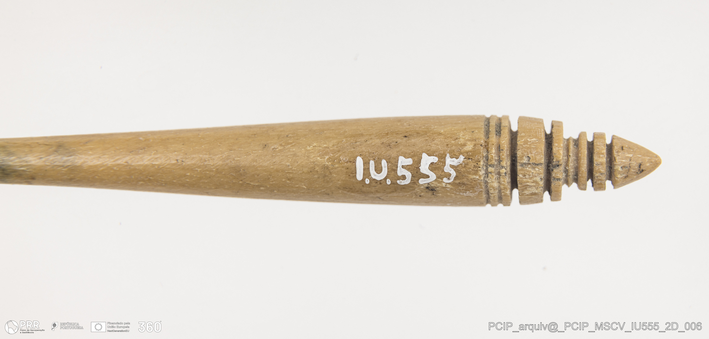 Matéria/Técnica: Osso; Cronologia: Século XVII; Autoria: Desconhecida; Dimensões: Comprimento: 99mm; Espessura: 8mm.
