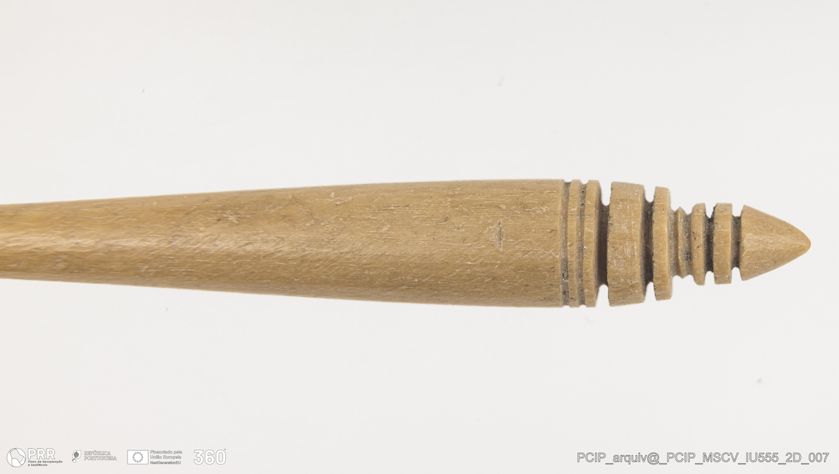 Matéria/Técnica: Osso; Cronologia: Século XVII; Autoria: Desconhecida; Dimensões: Comprimento: 99mm; Espessura: 8mm.