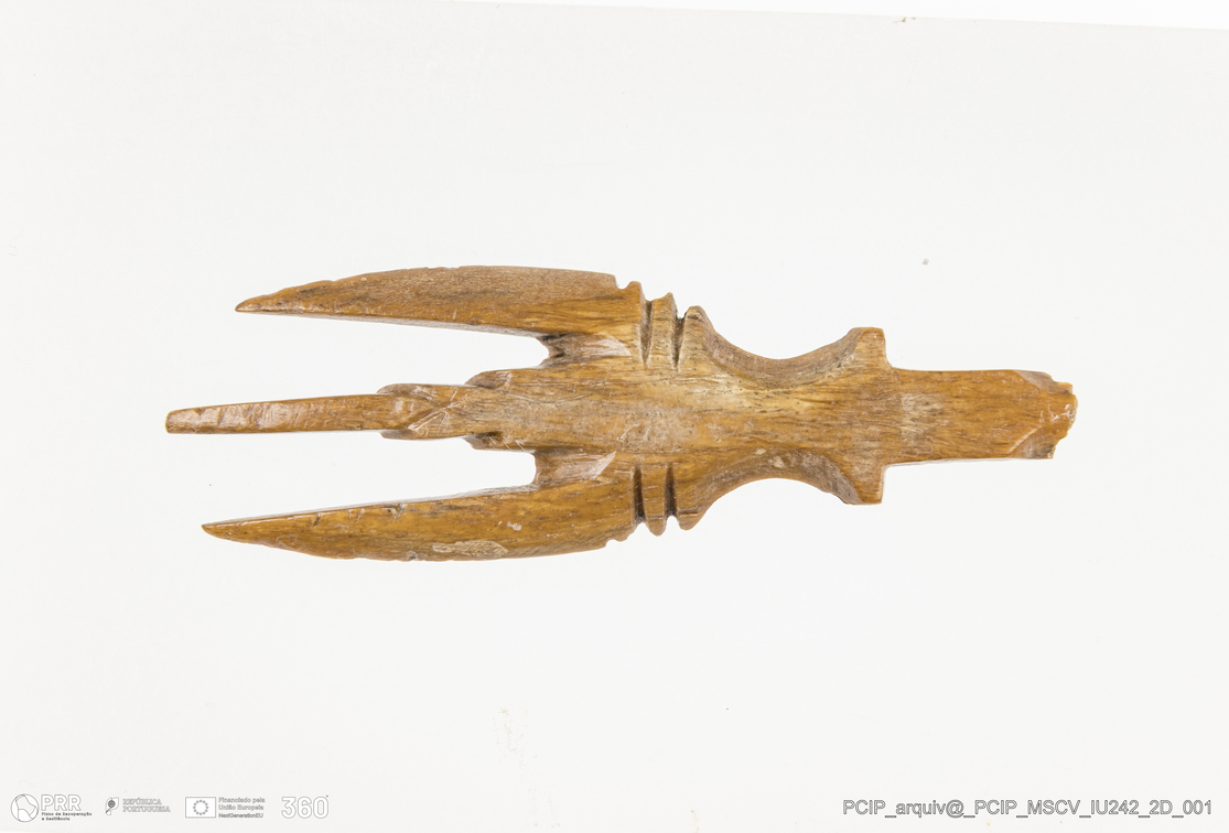 Matéria/Técnica: Osso; Cronologia: Século XVII; Autoria: Desconhecida; Dimensões: Comprimento: 53mm; Altura: 16,5mm; Espessura: 5mm.