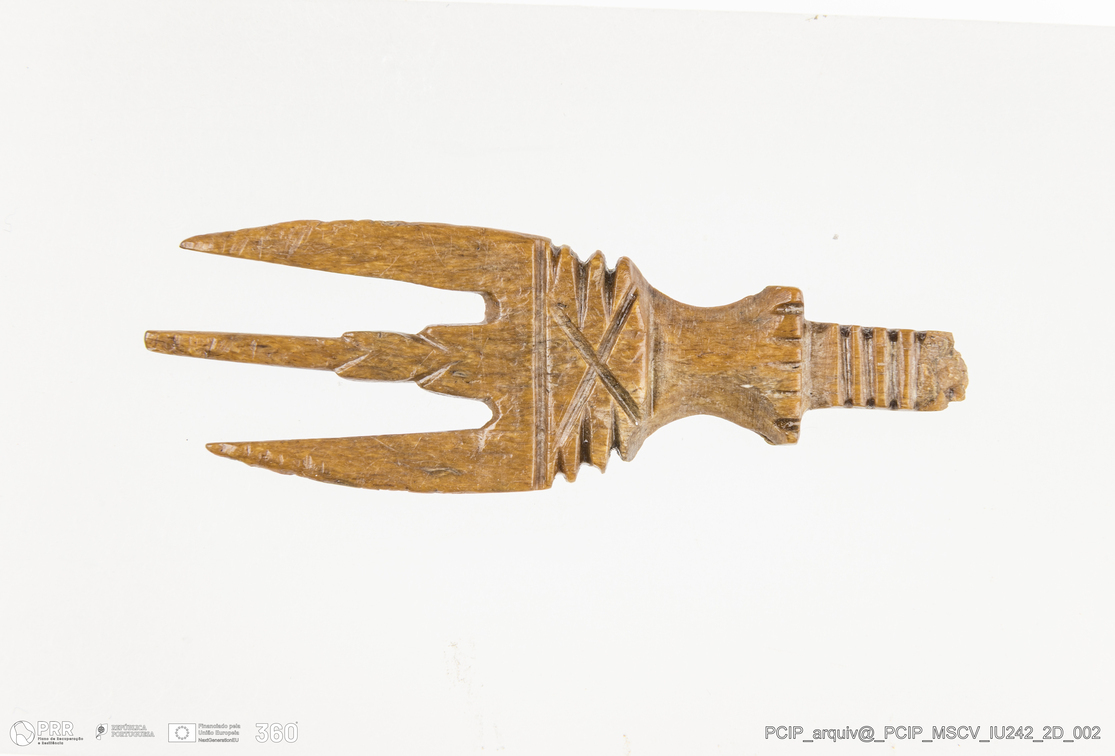 Matéria/Técnica: Osso; Cronologia: Século XVII; Autoria: Desconhecida; Dimensões: Comprimento: 53mm; Altura: 16,5mm; Espessura: 5mm.