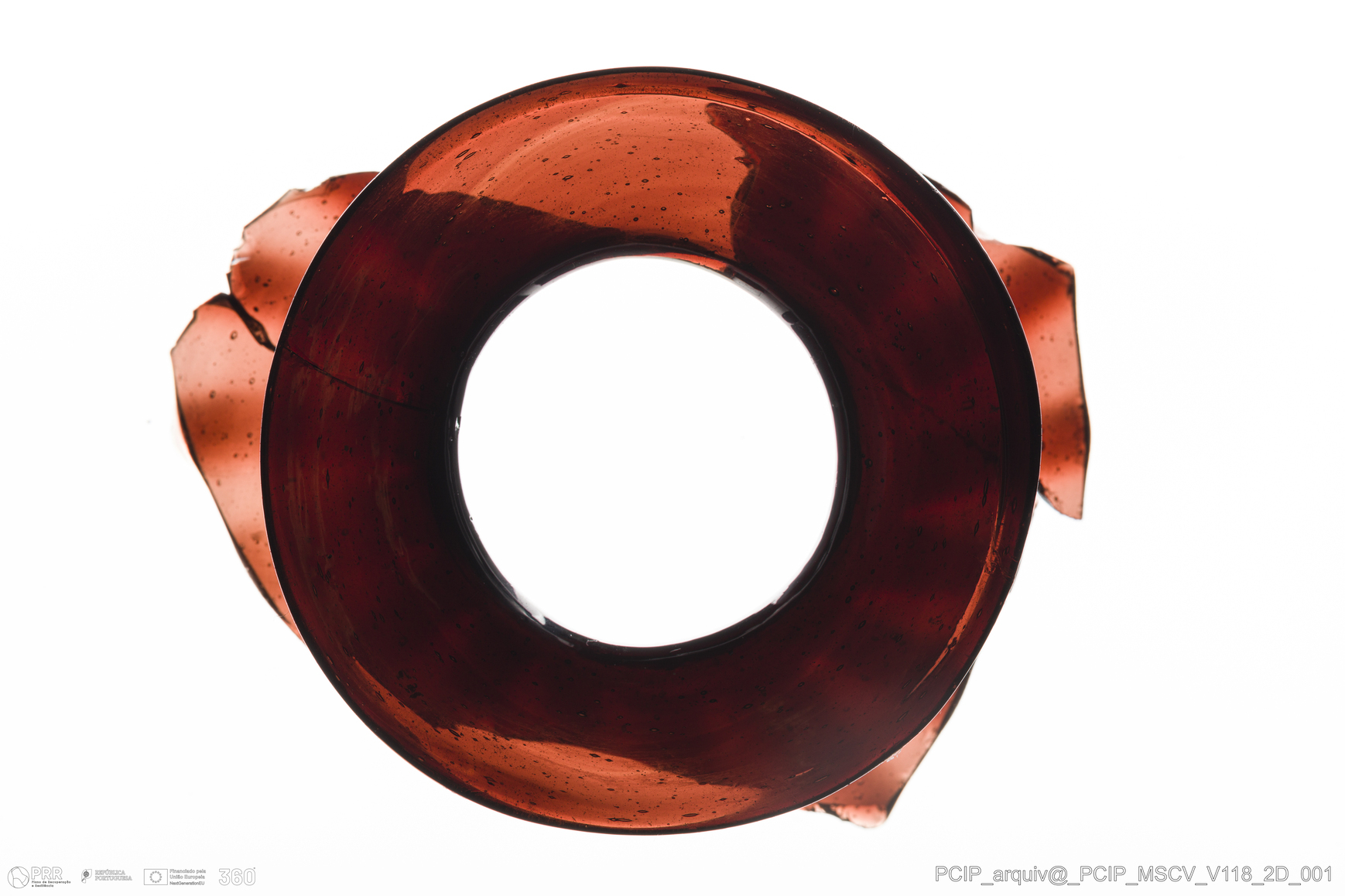 Matéria/Técnica: Vidro; Cronologia: Século XVII; Autoria: Desconhecida; Dimensões: Diâmetro bordo: 53mm.