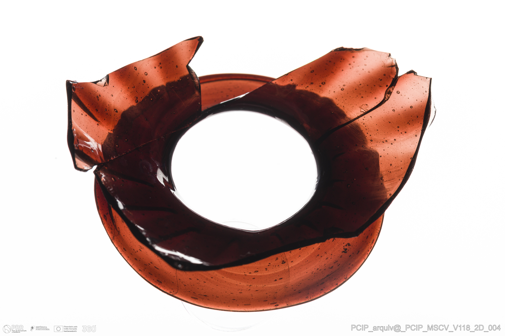 Matéria/Técnica: Vidro; Cronologia: Século XVII; Autoria: Desconhecida; Dimensões: Diâmetro bordo: 53mm.