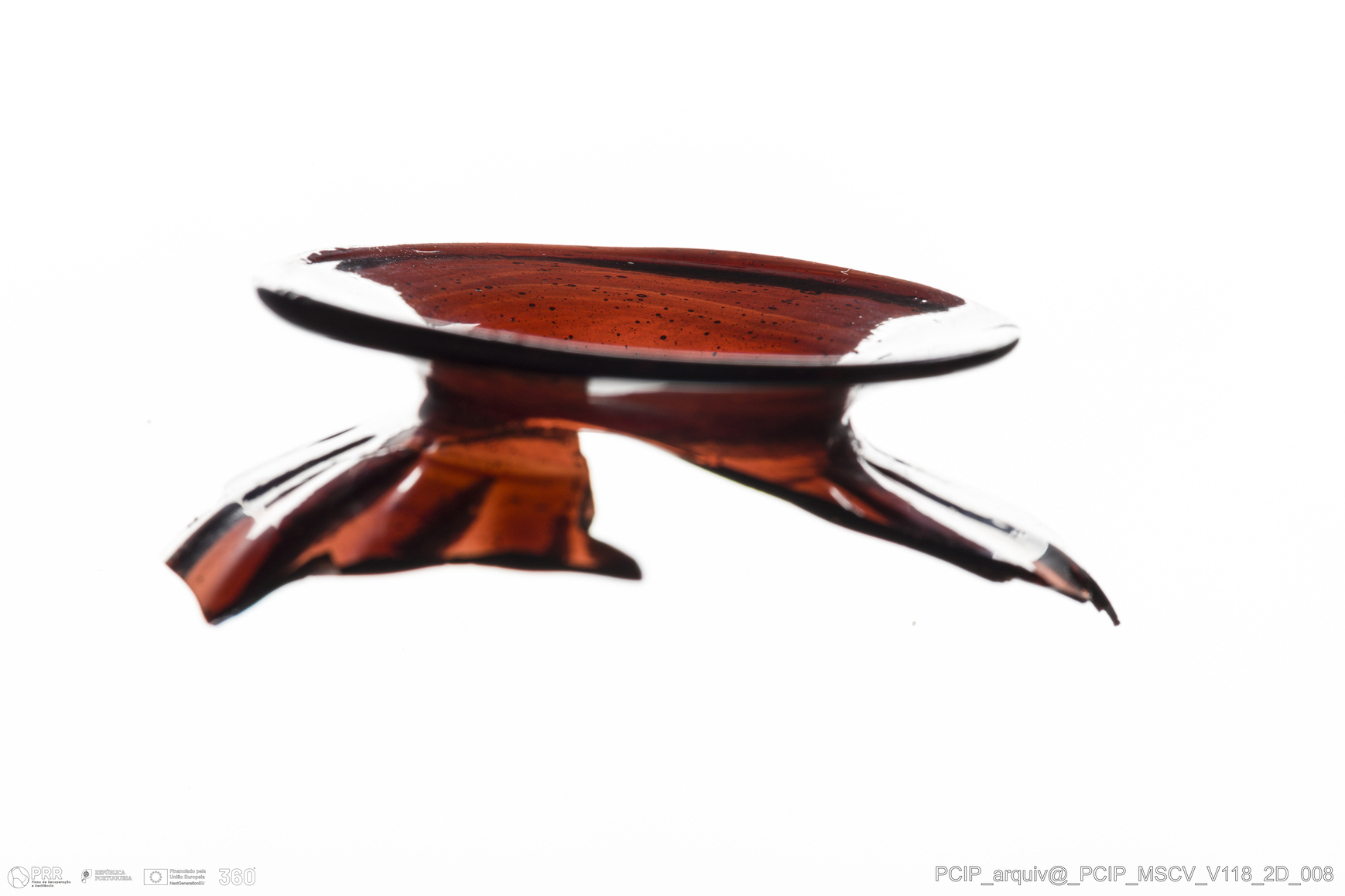 Matéria/Técnica: Vidro; Cronologia: Século XVII; Autoria: Desconhecida; Dimensões: Diâmetro bordo: 53mm.