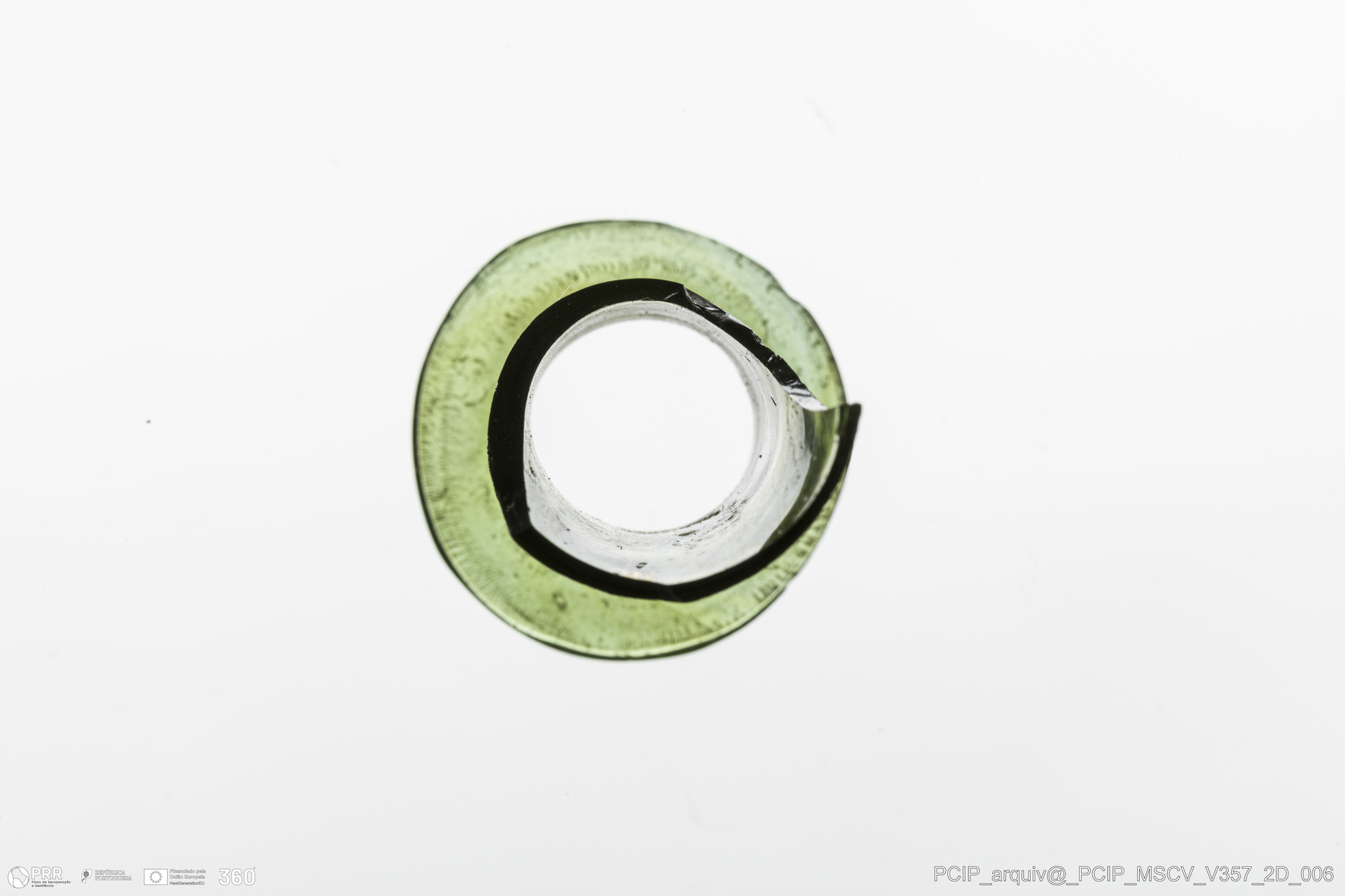 Matéria/Técnica: Vidro; Cronologia: Século XVII; Autoria: Desconhecida; Dimensões: Diâmetro bordo: 23mm.