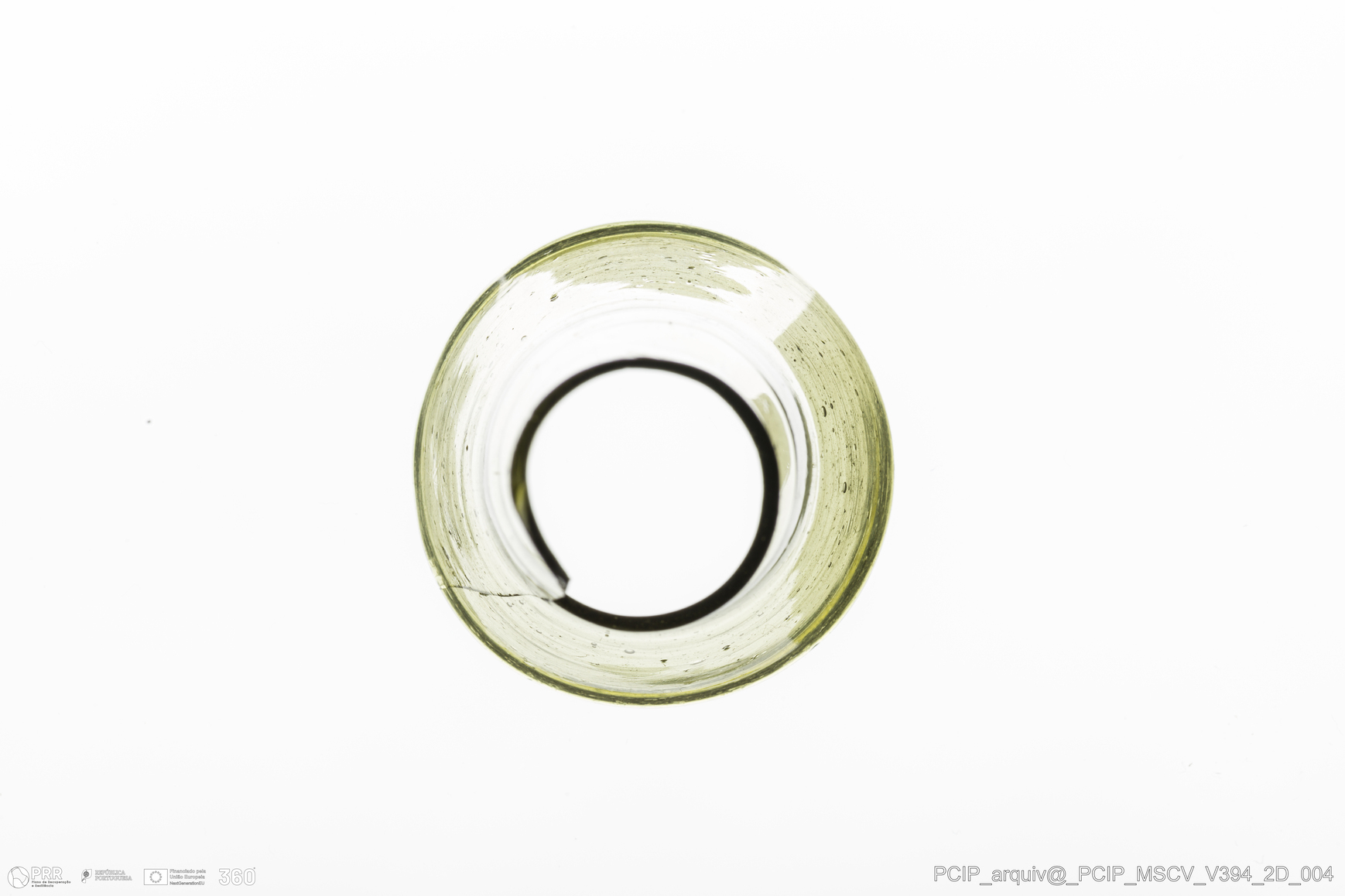 Matéria/Técnica: Vidro; Cronologia: Século XVII; Autoria: Desconhecida; Dimensões: Diâmetro bordo: 38mm.