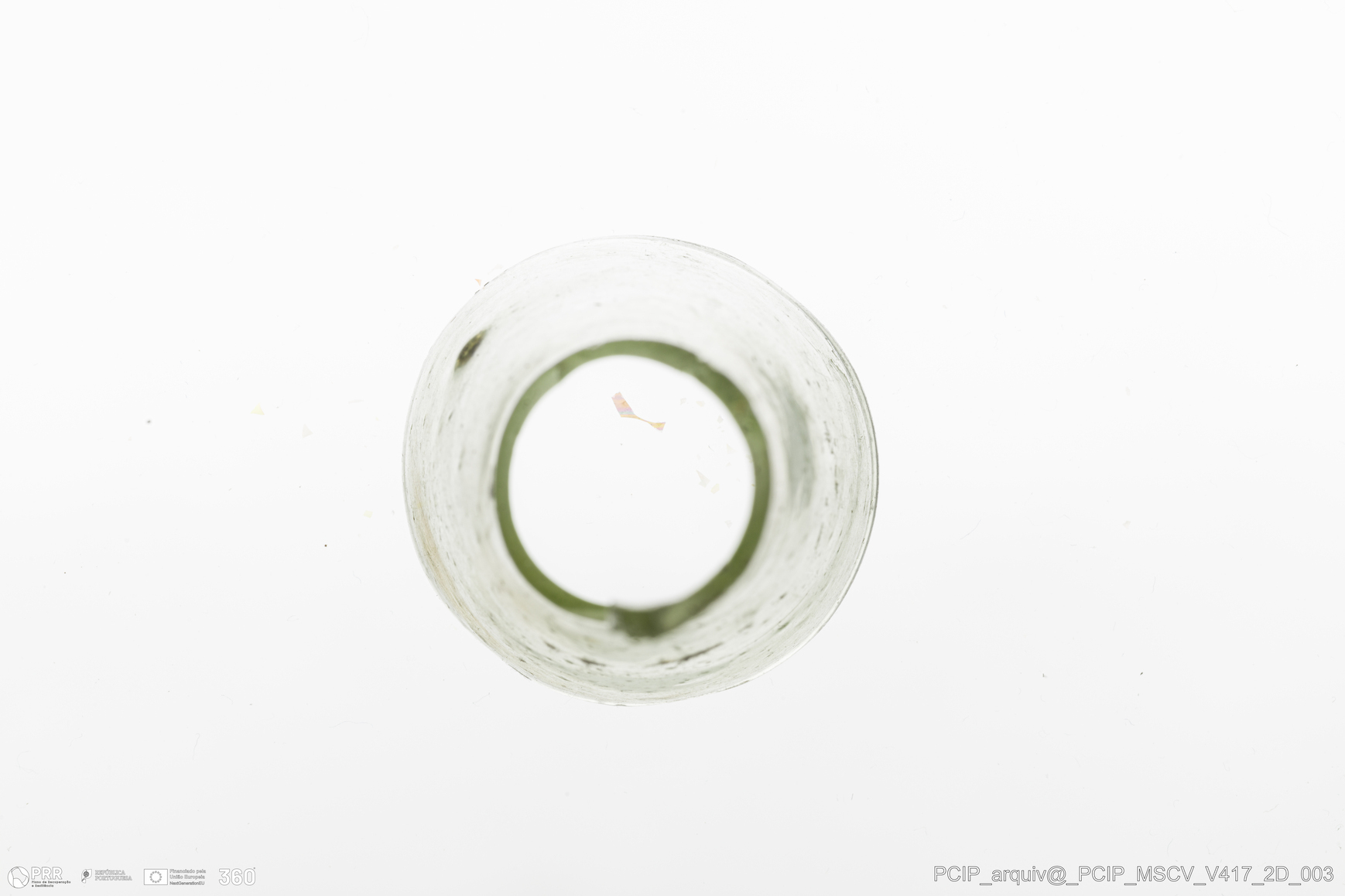 Matéria/Técnica: Vidro; Cronologia: Século XVII; Autoria: Desconhecida; Dimensões: Diâmetro bordo: 35mm.