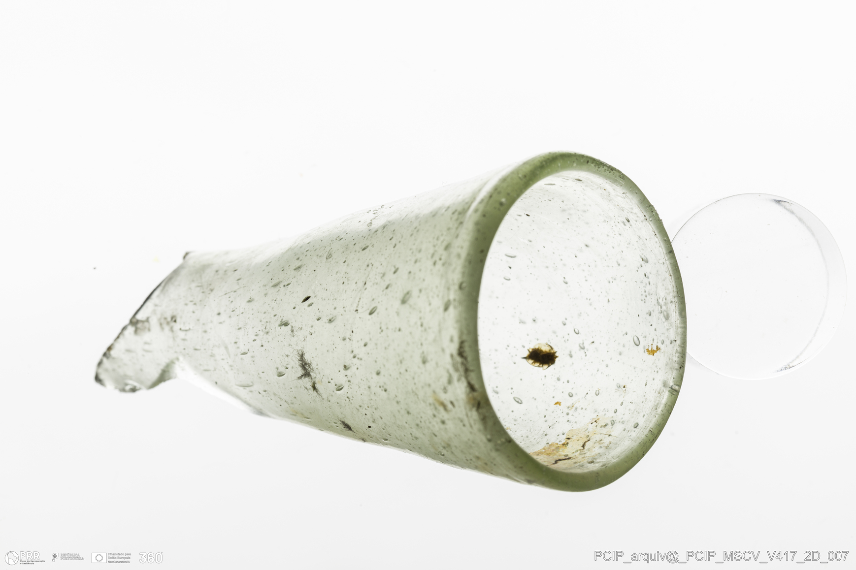 Matéria/Técnica: Vidro; Cronologia: Século XVII; Autoria: Desconhecida; Dimensões: Diâmetro bordo: 35mm.