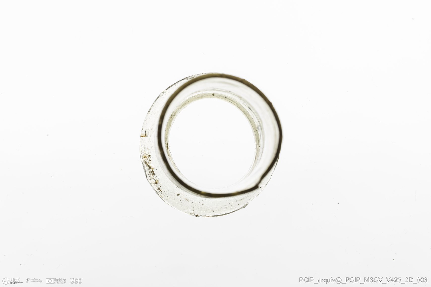 Matéria/Técnica: Vidro; Cronologia: Século XVII; Autoria: Desconhecida; Dimensões: Diâmetro bordo: 40mm.