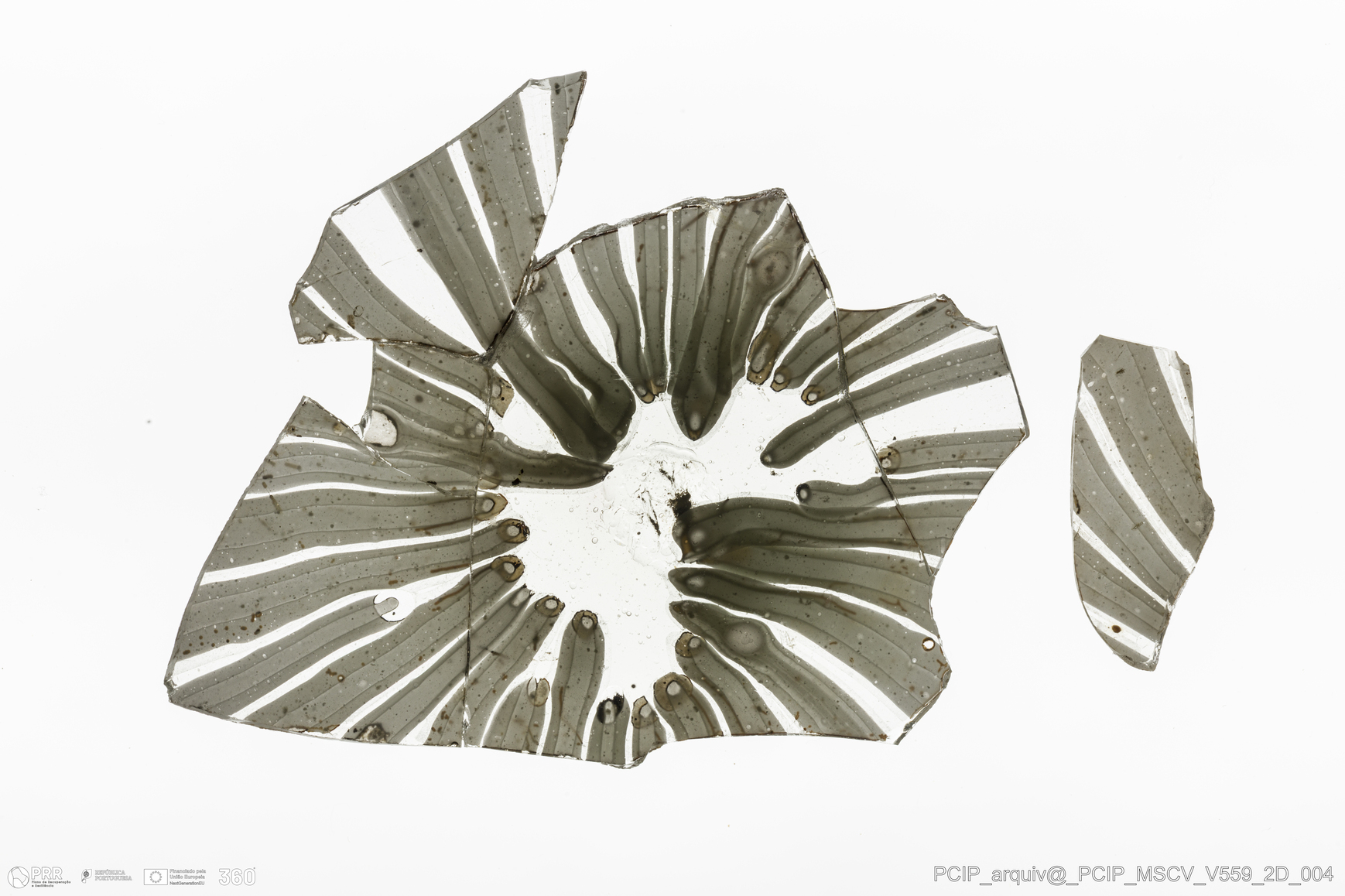 Matéria/Técnica: Vidro; Cronologia: Século XVII; Autoria: Desconhecida; Dimensões: comprimento: 103mm; Largura: 81mm.