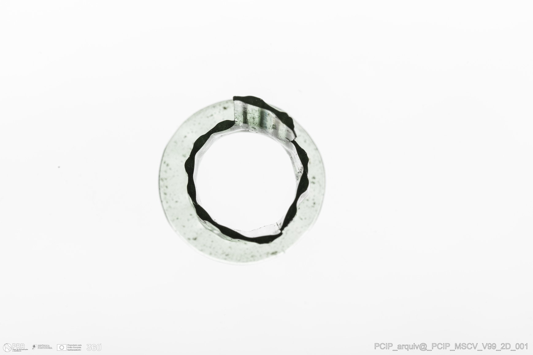 Matéria/Técnica: Vidro; Cronologia: Século XVII; Autoria: Desconhecida; Dimensões: Diâmetro bordo: 33mm.