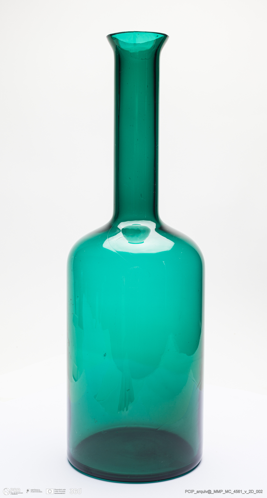 Matéria/Técnica: Vidro verde; Cronologia: século XX; Autoria: Otto Brauer / Holmegaard / Dinamarca; Dimensões (cm): Altura: 40; Diâmetro: 13.