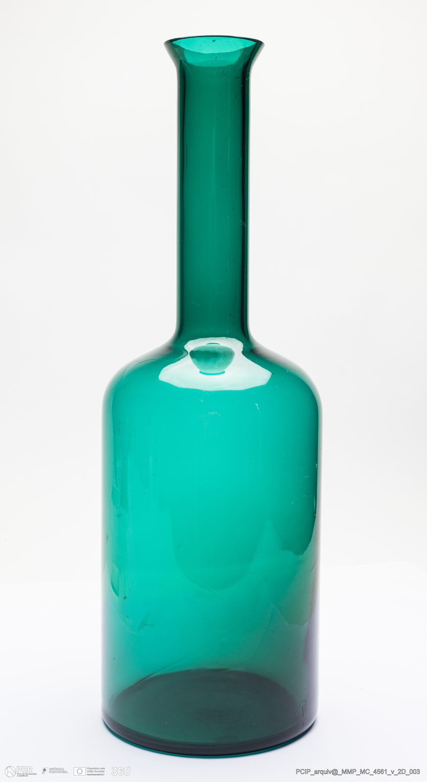 Matéria/Técnica: Vidro verde; Cronologia: século XX; Autoria: Otto Brauer / Holmegaard / Dinamarca; Dimensões (cm): Altura: 40; Diâmetro: 13.