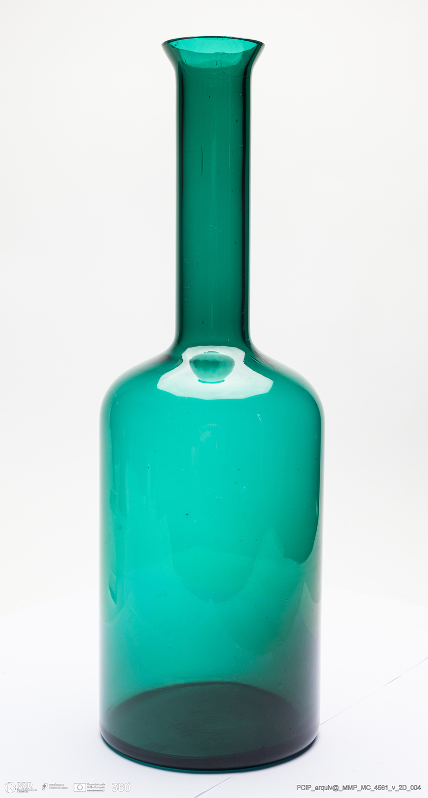 Matéria/Técnica: Vidro verde; Cronologia: século XX; Autoria: Otto Brauer / Holmegaard / Dinamarca; Dimensões (cm): Altura: 40; Diâmetro: 13.