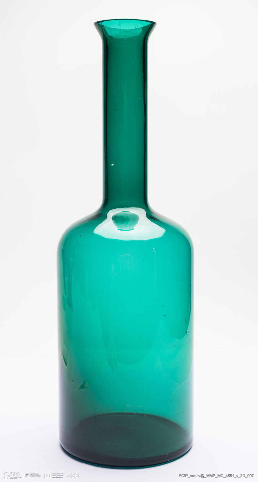 Matéria/Técnica: Vidro verde; Cronologia: século XX; Autoria: Otto Brauer / Holmegaard / Dinamarca; Dimensões (cm): Altura: 40; Diâmetro: 13.