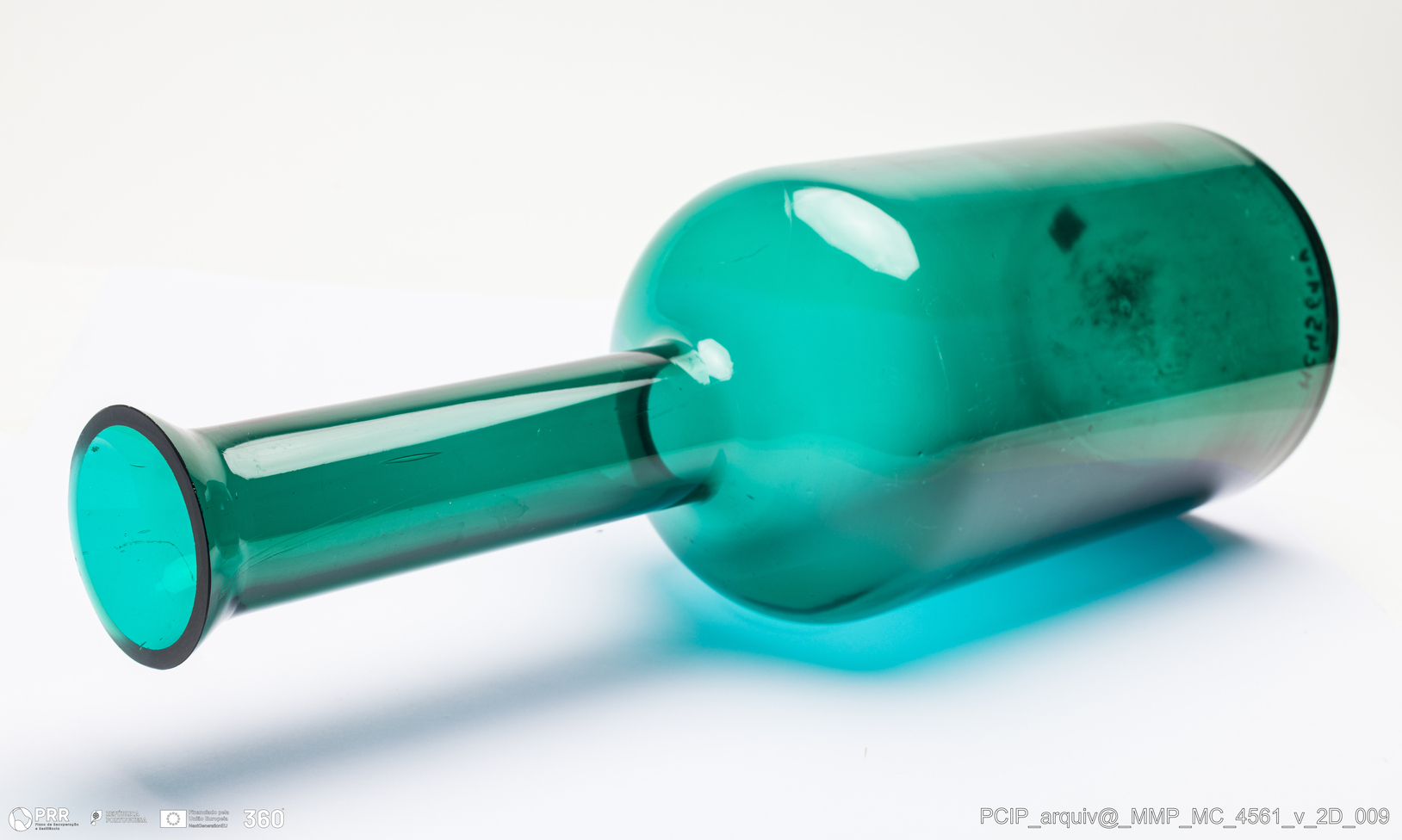 Matéria/Técnica: Vidro verde; Cronologia: século XX; Autoria: Otto Brauer / Holmegaard / Dinamarca; Dimensões (cm): Altura: 40; Diâmetro: 13.