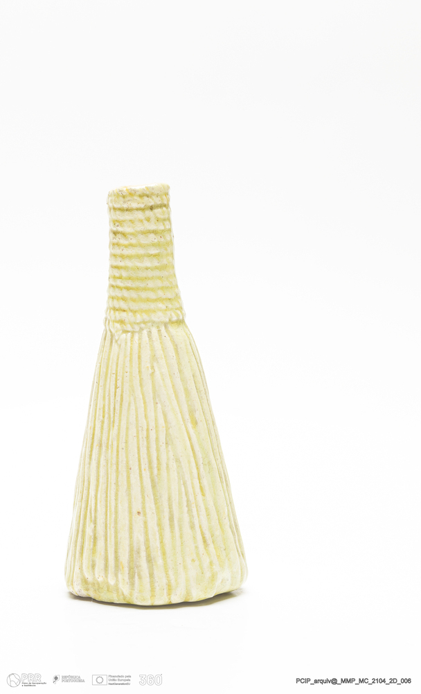 Matéria/Técnica: Barro branco moldado. Vidrado monocromo camurça; Cronologia: 1902-1925; Autoria: António Alves Cunha, Caldas da Rainha; Dimensões (cm): Altura: 11; Diâmetro: 4,5.